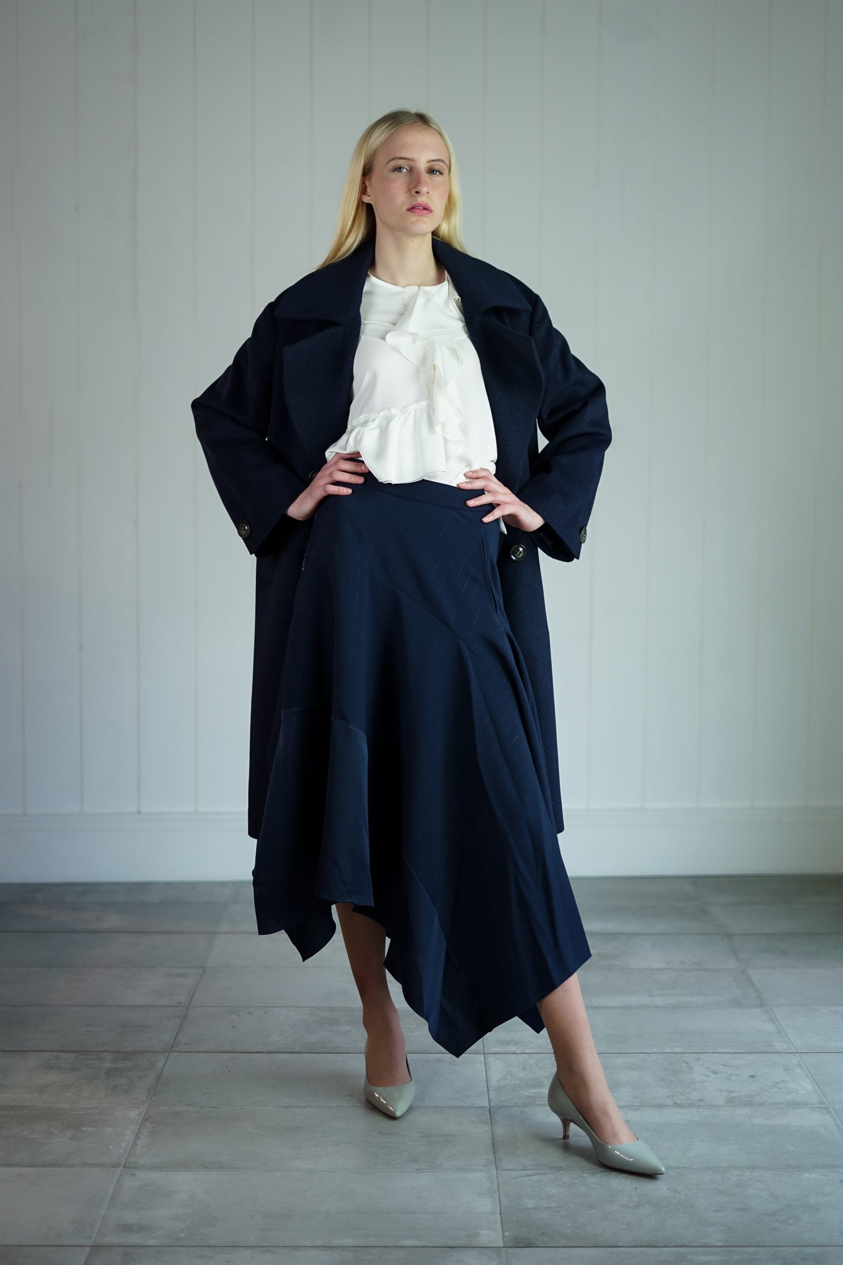 This women’s outfit features the Anke Cashmere Coat from Sand Copenhagen. This coat features a beautiful Cashmere and Wool blend with a casual collared neckline and chunky design to keep you looking cool while keeping you warm. This great coat is paired with the Flutter shirt from High. The contrast of the cream colour and the frilled design on the front of the top allows you to have a piece of elegant and creativity to the outfit. The finishing part of the outfit is the Transient skirt from High. The skirt is featuring a twill design and elasticated waist for a comfortable fit.