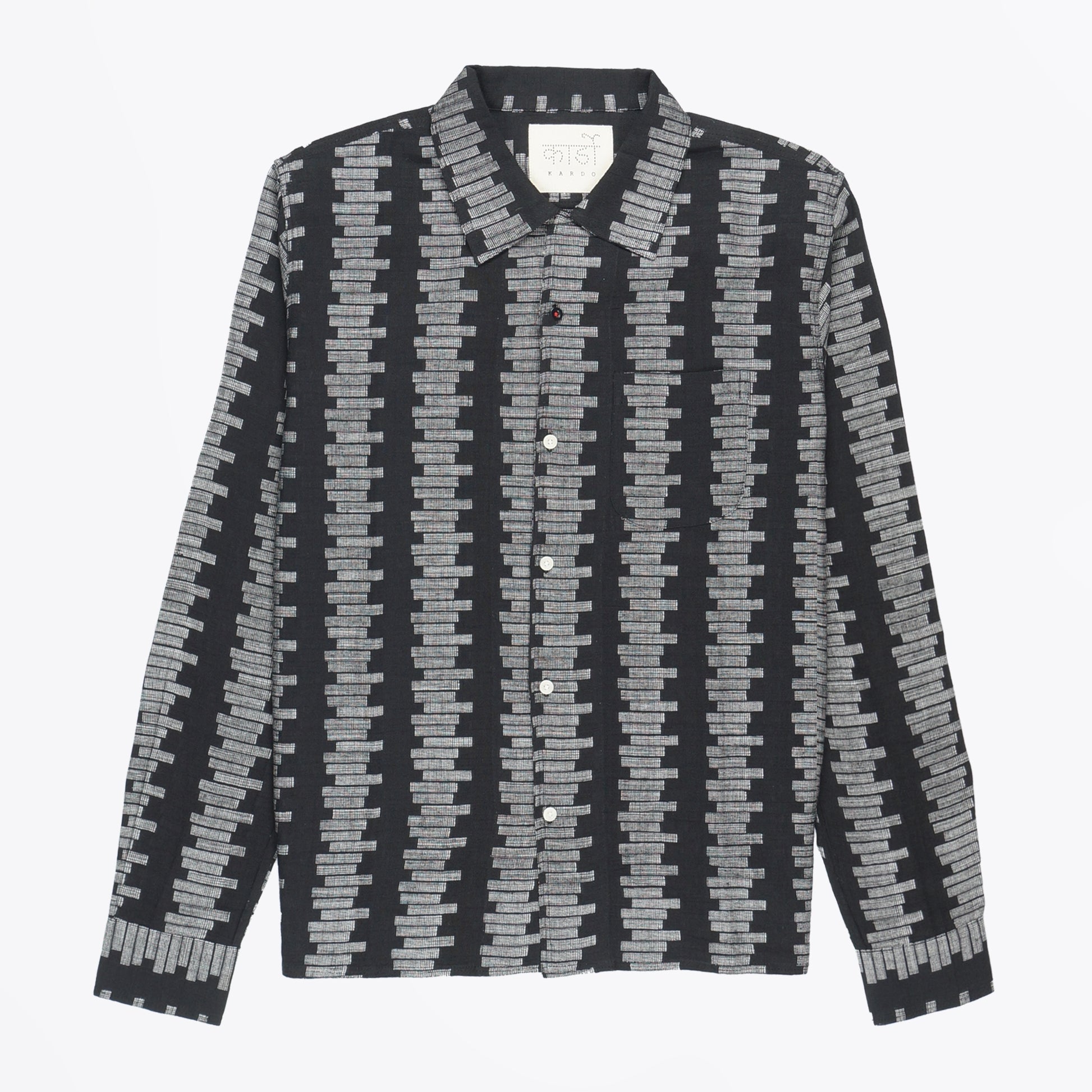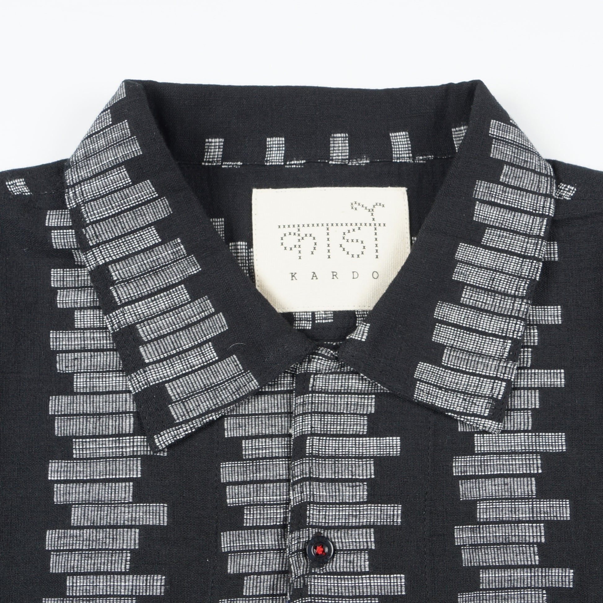 One of our newest menswear labels, KARDO is inspired by traditional workwear and tailoring. KARDO dresses the modern man with subtle twists on classic silhouettes and honours traditional weaving, dyeing, and printing techniques in India. The brand actively supports and collaborate with handloom weaving communities throughout India in the hope that these traditional techniques don’t die out and their impact on the environment is as low as possible. This black Chintan rice stitch shirt is made with cotton gauze and features Long sleeves, a rice stitch embroidery pattern, a button up fastening, and a casual collar neckline. Wear this shirt with a pair of designer trousers and a pair of your favourite designer trainers