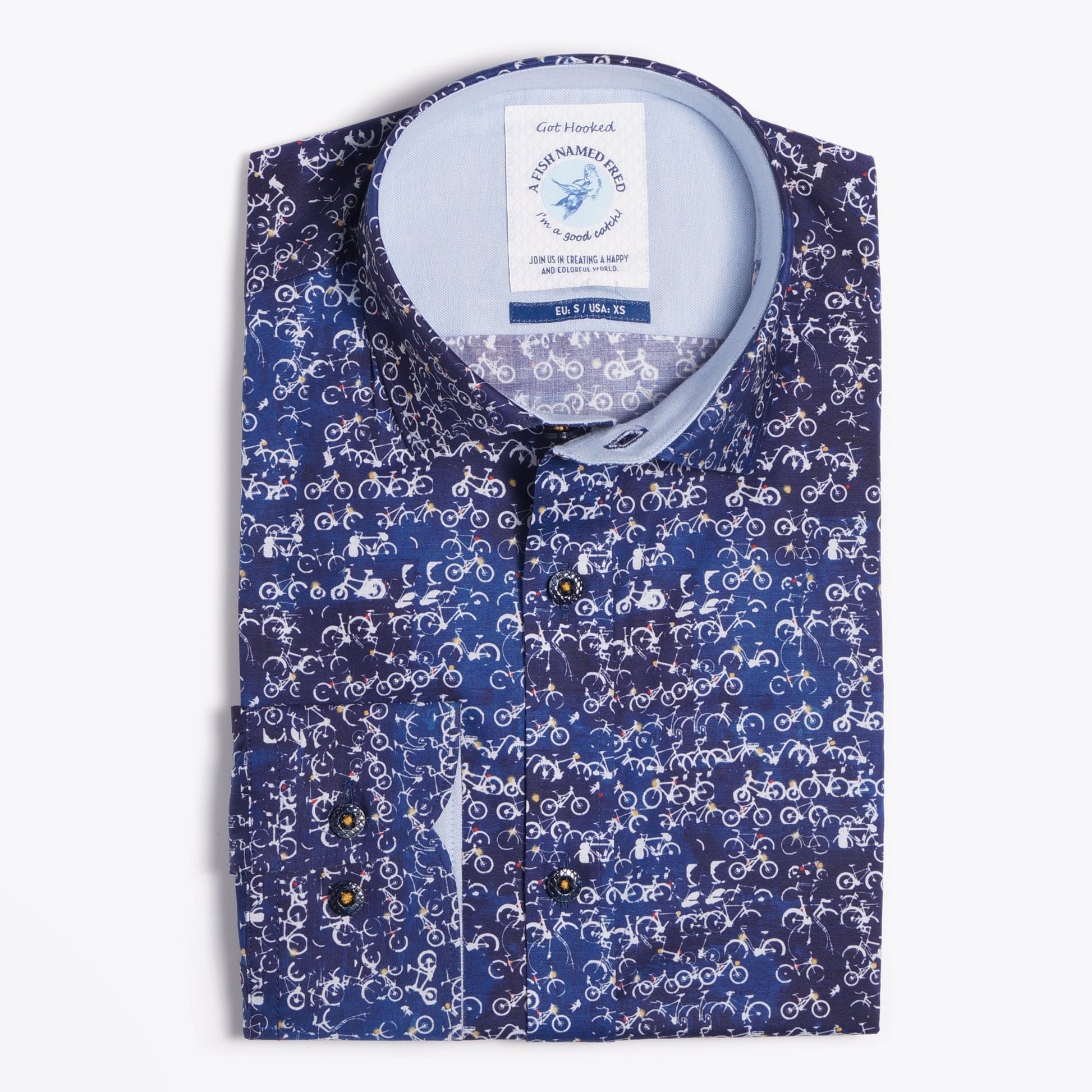 A Fish Named Fred is a fresh brand that designs colourful shirts with luxurious materials and refined details to help a modern man stand out in the crowd. This playful all-over green lion print shirt is made from a stretch cotton blend and cut for a tailored silhouette. The features of this shirt are a turndown collar, blue ombre textured button fastening with a yoke and darts on the back. The shirt has been finished with adjustable two-button barrel cuff, rounded at the bottom and a slim fit with a narrow cut at the shoulders and waist. This fashion-forward and vibrant shirt is sure to make you stand out from the crowd. Wear it with one of our chinos or combine it with our waistcoat and blazer for a complete look.