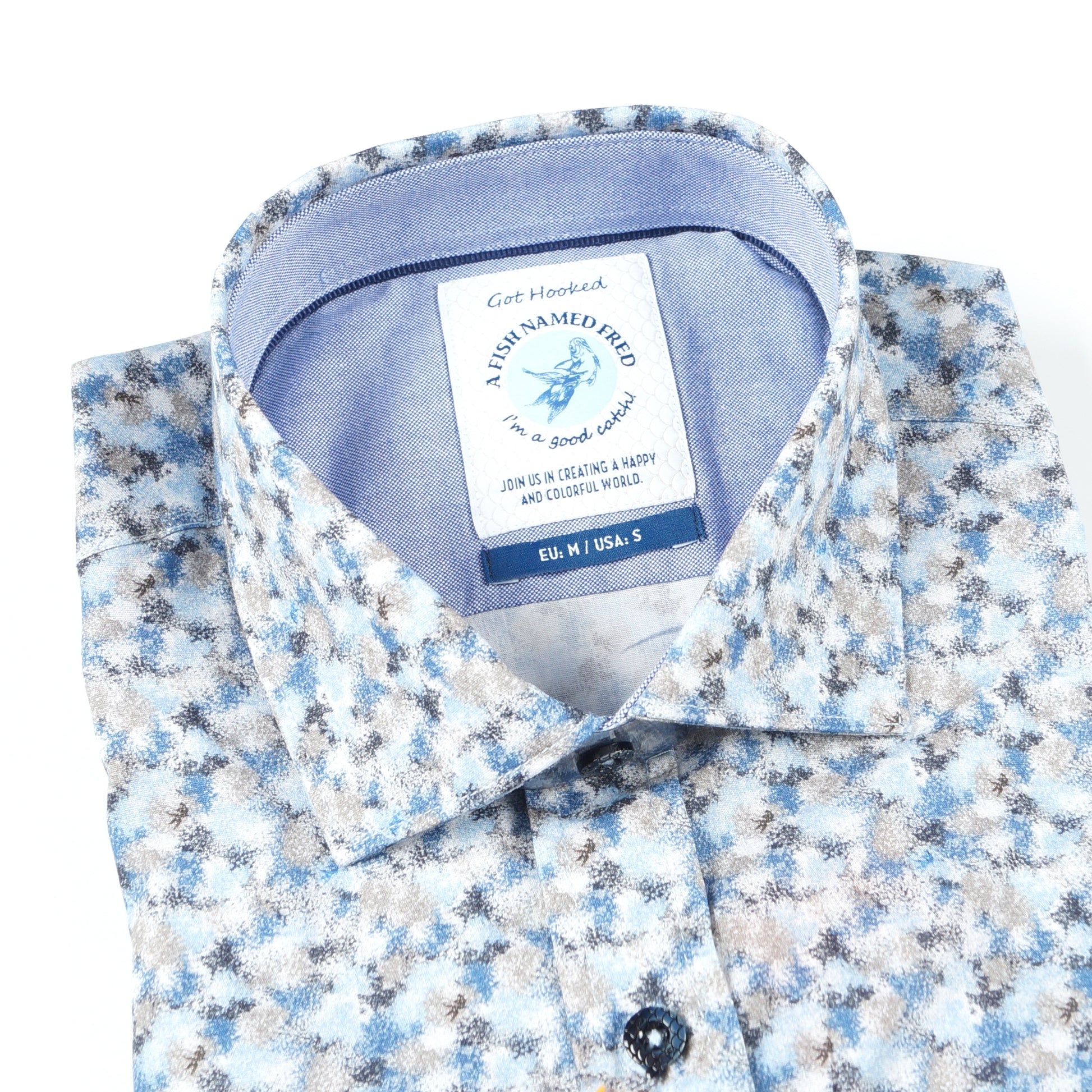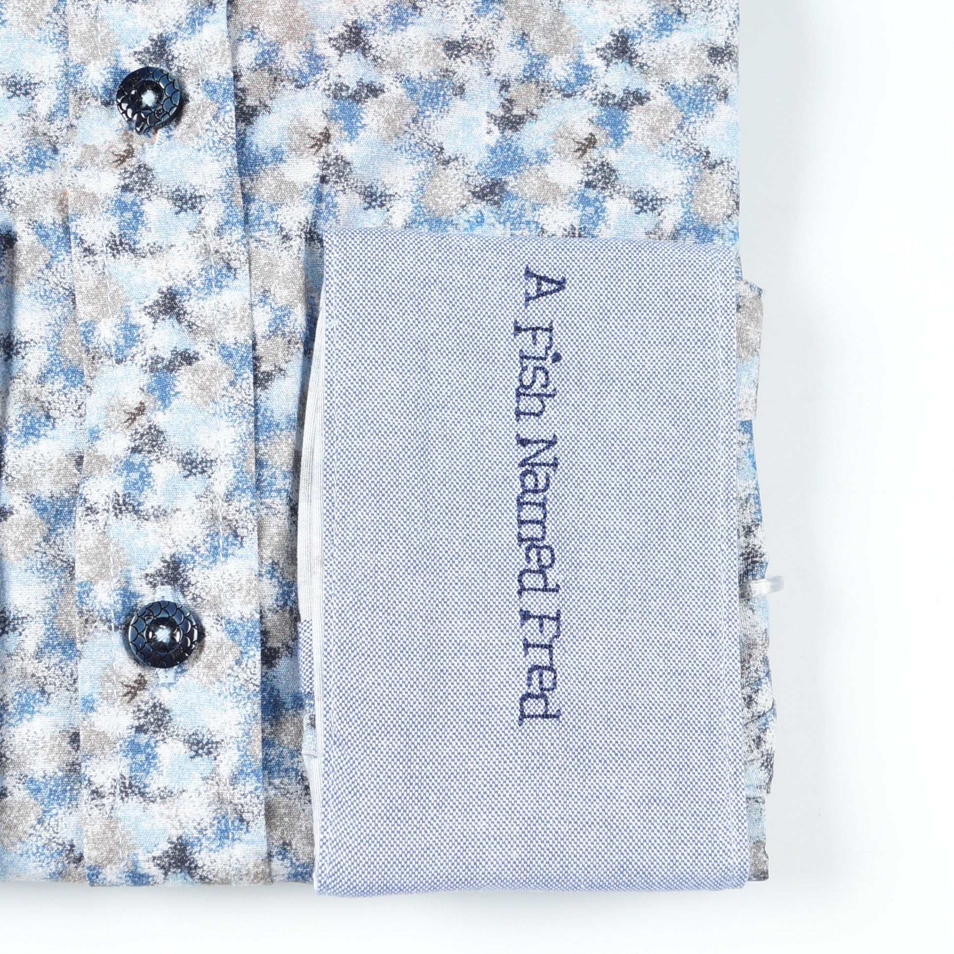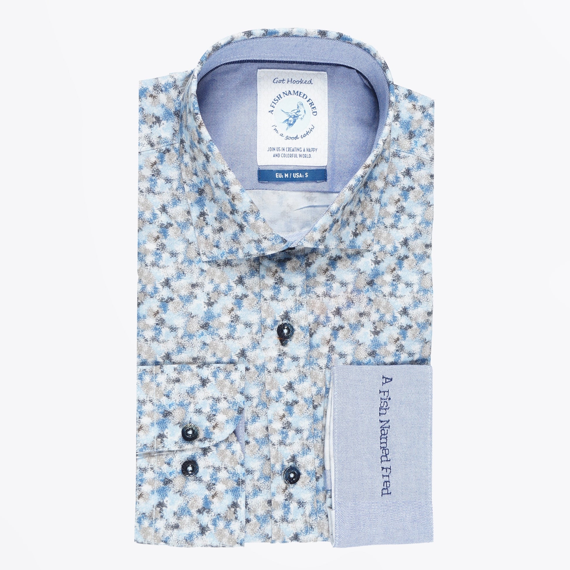 A Fish Named Fred is a fresh brand that designs colourful shirts with luxurious materials and refined details to help a modern man stand out in the crowd. Add a quirky print to your new season shirts with a fun animal themed pattern. Featuring a blue paint dab design, this shirt has navy button-up fastening, a collared neckline, a branded embroidery of the company name on the left cuff in navy stitching, and buttoned cuffs. Wear this shirt to add some variety into your suits this season.