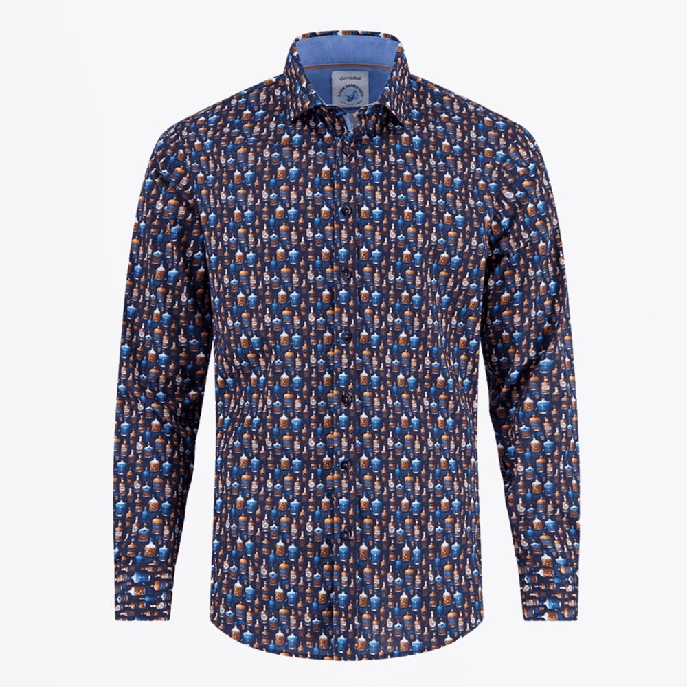 A Fish Named Fred is a fresh brand that designs colourful shirts with luxurious materials and refined details to help a modern man stand out in the crowd. Add a quirky print to your new season shirts with this fun option. This navy bottle print shirt features a beautiful bottle design, a button-up fastening, a collared neckline, a branded embroidery logo on the left cuff in contrast stitching, and buttoned cuffs. Wear this shirt to add some variety to your summer shirt game this season.