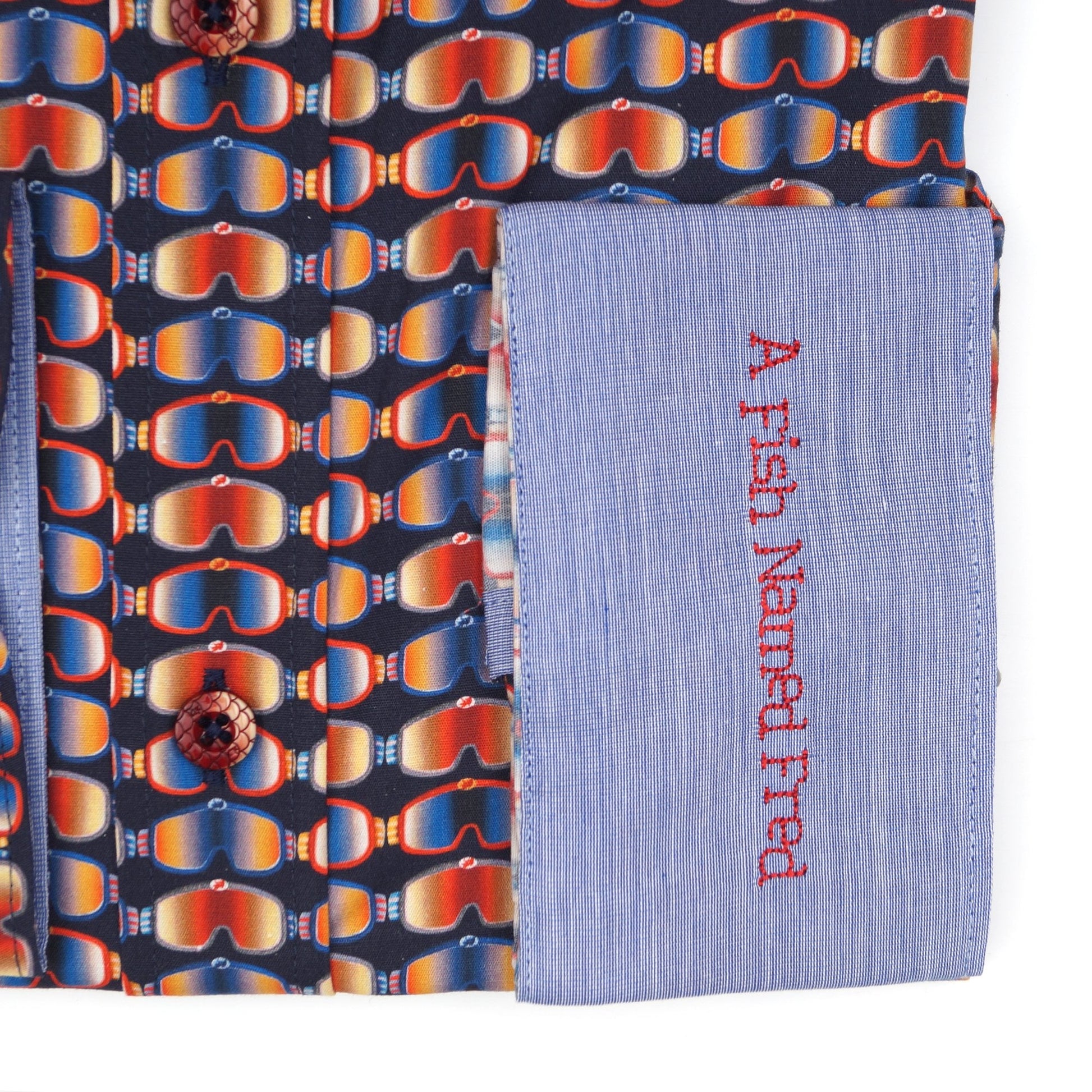 A Fish Named Fred is a fresh brand that designs colourful shirts with luxurious materials and refined details to help a modern man stand out in the crowd. Add a quirky print to your new season shirts with a fun ski-themed pattern. Featuring a printed ski-google design on a navy background, this button-down shirt has interesting red ombre fish scale buttons stitched on with a navy thread. This shirt also has a collared neckline with contrasting inner fabric, a branded embroidery of the company name on the left cuff in red stitching, and buttoned cuffs. Wear this shirt to add some variety into your suits this season.