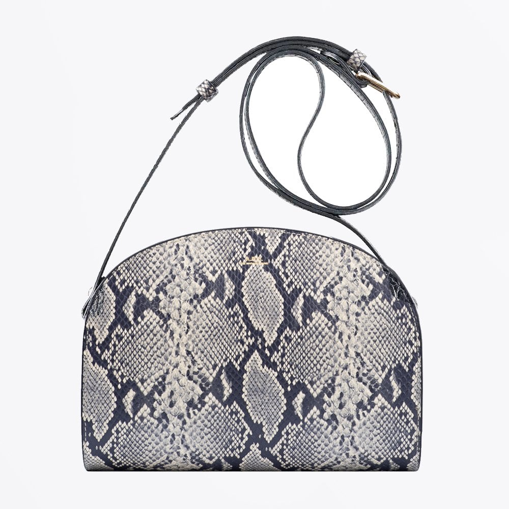 Crafted in a beige python embossed motif in leather with an adjustable strap, this classic half-moon shoulder bag is the perfect stylish handbag for all seasons. Added features include a two-way zip closure on top, interior patch pocket, A.P.C. logo embossed on the front, topstitched edges and gold toned hardware. Team your stylish handbag alongside a relaxed tailored outfit to complete our look!