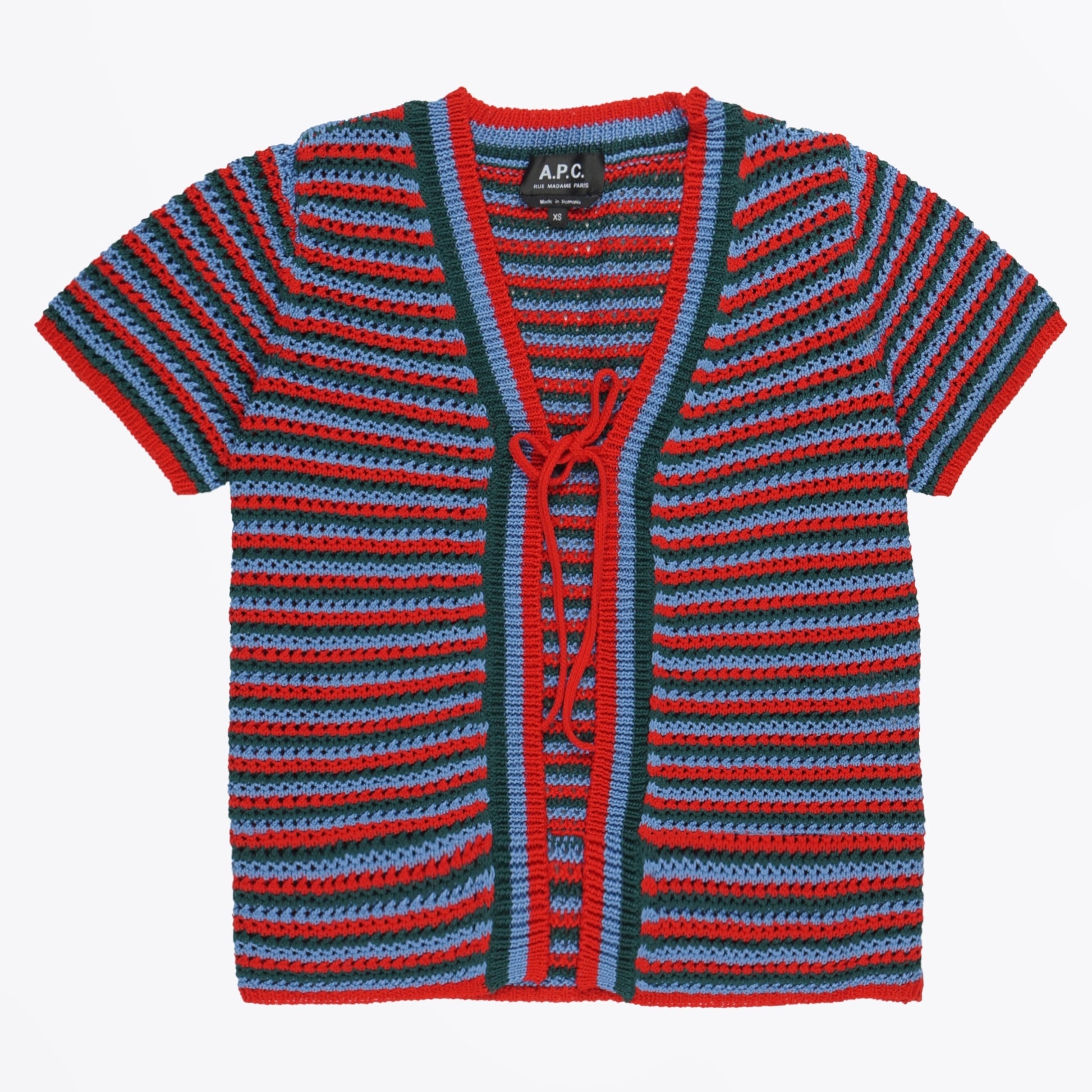 A.P.C. incorporates a contemporary Parisian sophistication offering classical tailoring, premium textiles and refined wardrobe essentials reflecting an unfussy elegance. Add colour and fun design to your casual outfit rotation with this stripy crochet top. This top features a crocheted red green and blue striped design, with short sleeves, a striped trim, and a tied fastening detail. Wear this top over a plain tee and with some designer jeans.