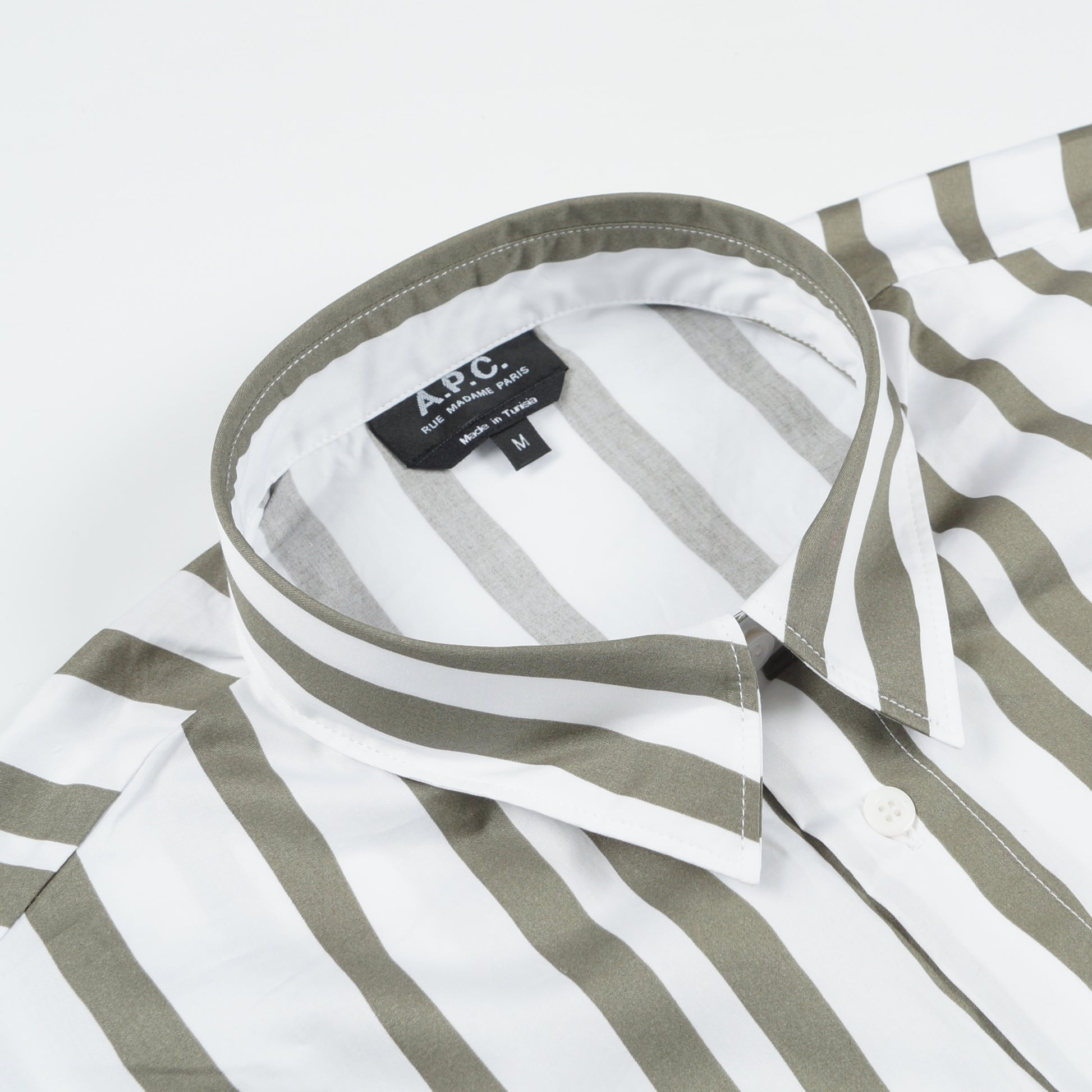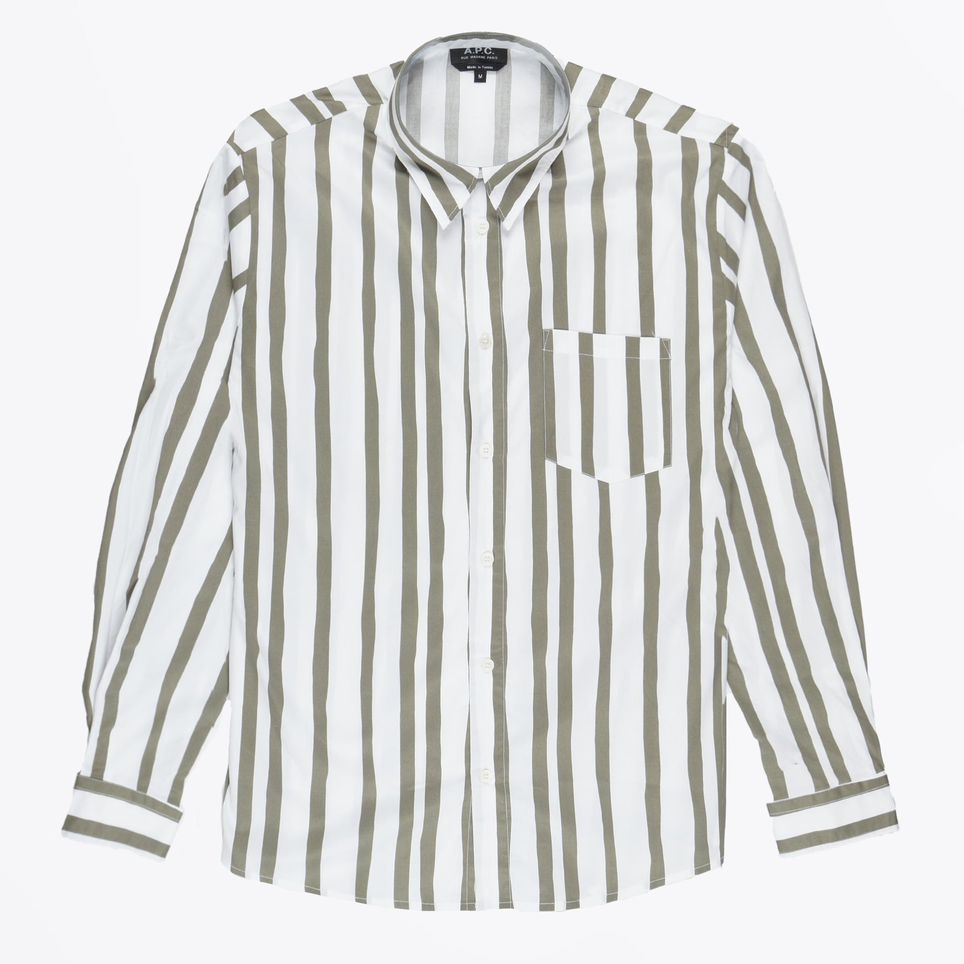 A.P.C. incorporates a contemporary Parisian sophistication offering classical tailoring, premium textiles and refined wardrobe essentials reflecting an unfussy elegance. Add some easy contemporary style to your new season wardrobe with this shirt from A.P.C. Crafted in a smooth cotton material, this shirt features a wonky stripe design in a sage green and white, with a button-down fastening, a collared neckline, and a breast pocket. Wear this shirt open over a plain t-shirt with some Universal Works trousers.