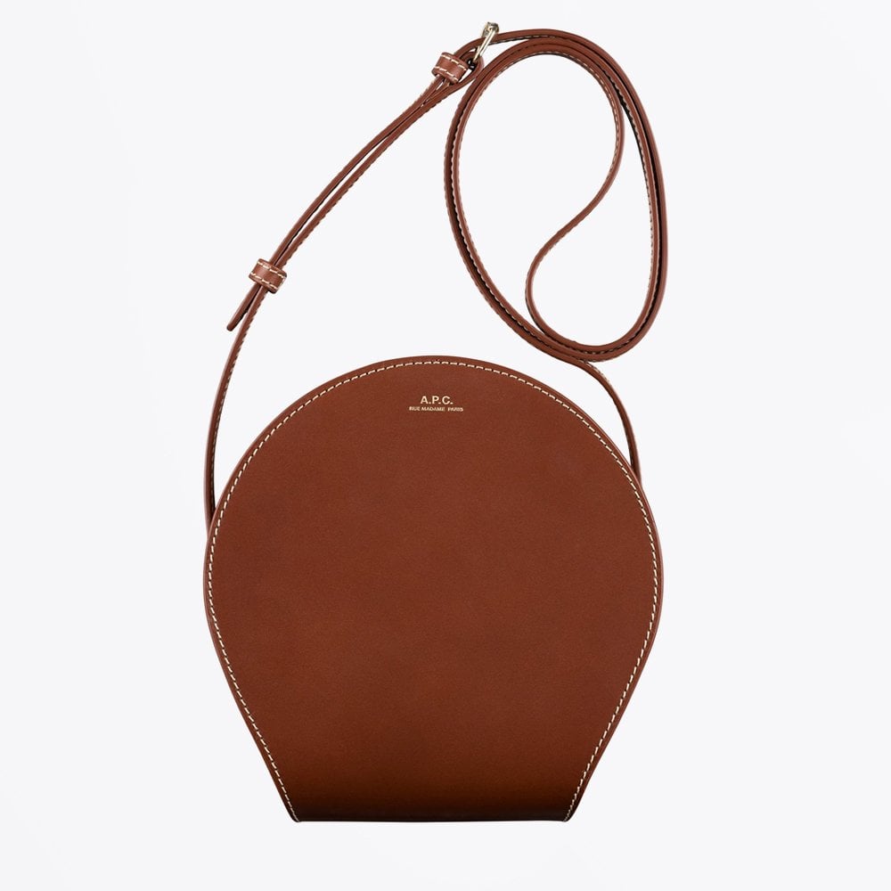 Smooth calfskin. Horseshoe shape. Two-way zip closure on top. One interior patch pocket. Shoulder strap adjusts with buckle. May be carried on shoulder or across chest. Cotton lining. Contrasting topstitched edges. Goldtone "A.P.C. rue Madame Paris" logo embossed on front.