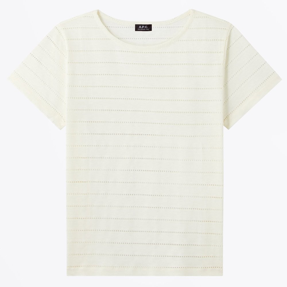 Openwork Supima cotton. Jacquard openwork jersey, recalling English embroidery. Soft feel. Crew neckline. Short set-in sleeves. Topstitched cuffs and hem. Straight hem.