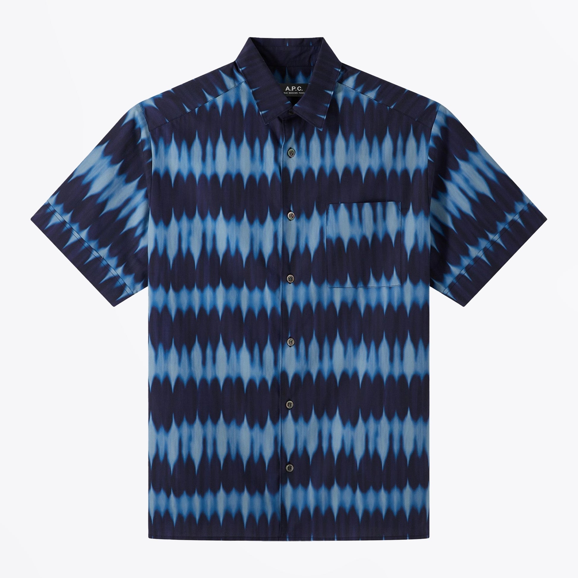 A.P.C. incorporates a contemporary Parisian sophistication offering classical tailoring, premium textiles and refined wardrobe essentials reflecting an unfussy elegance. A great way to add a fun print to your wardrobe, this top features a bled dye design in navy, with a button down fastening, short sleeves, a breast pocket, and a collared neckline. Wear this shirt with a pair of designer jeans.