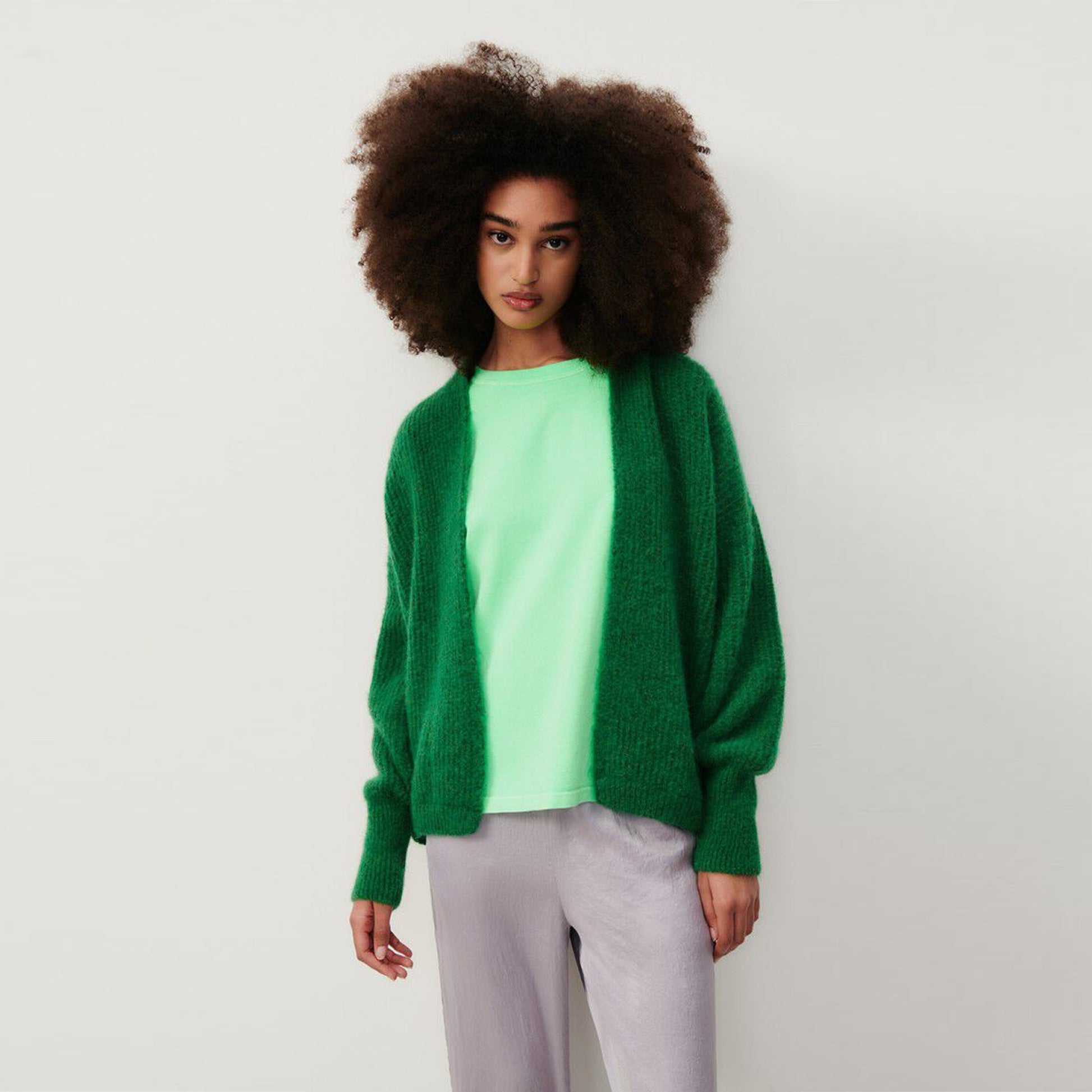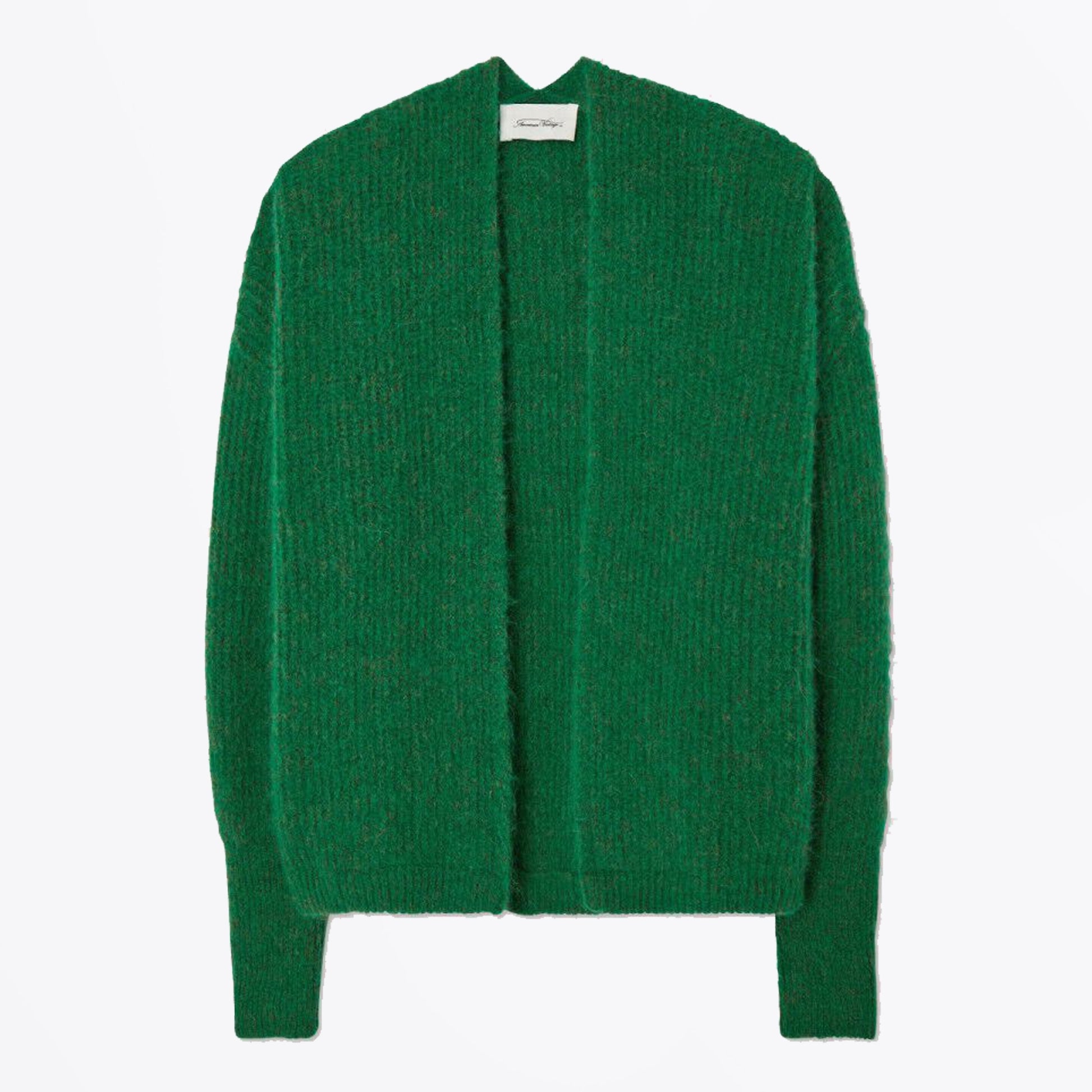 Introducing one of our newest women's labels, American Vintage to Mr & Mrs Stitch. Created in France in 2005 by Michael Azoulay, American Vintage has rapidly insinuated itself into the wardrobes of free-spirited young women through its timeless basics knits with their unique sense of simplicity.  American Vintage creates fashion that is stylish and comfortable, designed for free movement and subtle seduction. Adding casual comfort with designer quality to your seasonal outfits, this cardigan is crafted in soft knitted fabric, in a fashion forward grass melange green shade, and features a front open, with a ribbed hem and ribbed cuffs. Wear this cardigan with a pair of Paige jeans and your favourite pair of designer trainers.