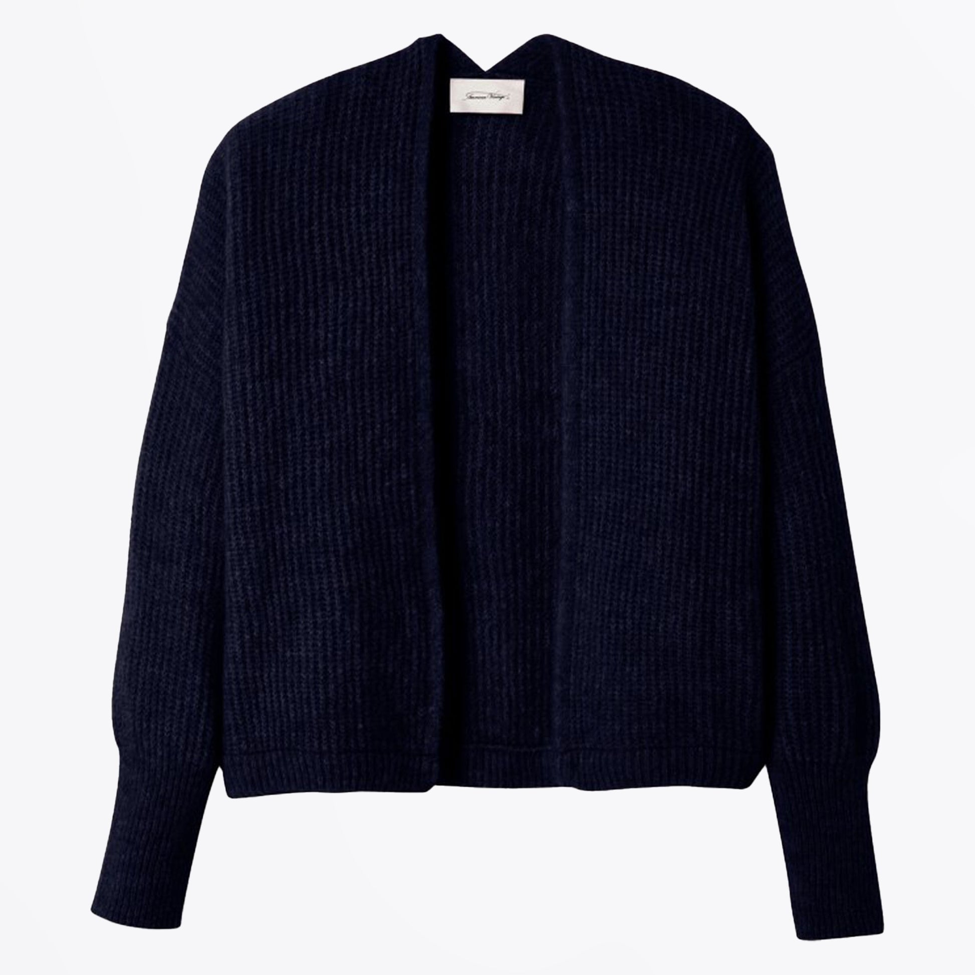 Introducing one of our newest women's labels, American Vintage to Mr & Mrs Stitch. Created in France in 2005 by Michael Azoulay, American Vintage has rapidly insinuated itself into the wardrobes of free-spirited young women through its timeless basics knits with their unique sense of simplicity.  American Vintage creates fashion that is stylish and comfortable, designed for free movement and subtle seduction. Adding casual comfort with designer quality to your seasonal outfits, this cardigan is crafted in soft knitted fabric, in a navy shade, and features a front open, with a ribbed hem and ribbed cuffs. Wear this cardigan with a pair of Paige jeans and your favourite pair of designer trainers.