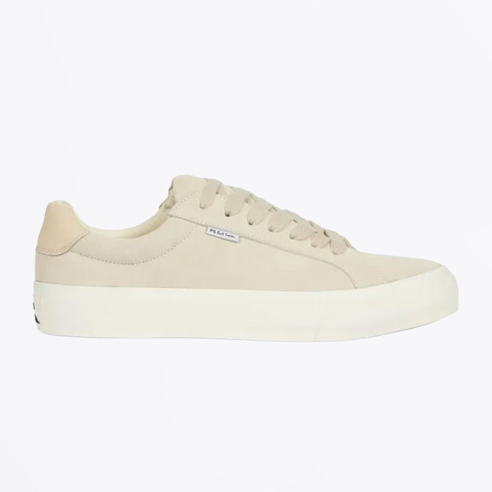 The Amos Trainers from PS Paul Smith epitomise contemporary smart casual style. This season's Off White iteration combines premium cow leather with refined craftsmanship—a suede upper pairs seamlessly with a contrasting leather heel tab, whilst vulcanised rubber soles deliver durability and understated elegance. Flat tonal laces maintain the minimalist aesthetic, complemented by signature PS Paul Smith branding on the side and heel. The standout detail lies within: a distinctive sports stripe adorns the insole, offering a subtle flash of colour that speaks to the brand's heritage. A versatile essential for the discerning wardrobe.