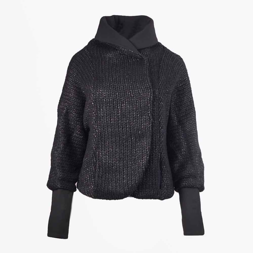Ania Schierholt conveys contemporary, comfort and practicality in her designs. The flexibility in mixing and matching fabrics and masterfully cut lines complement the female silhouette exquisitely. This chunky knit cardi is cut in a loose, relaxed style and crafted in a super soft wool blend providing warmth and comfort for everyday wear! Features of this cosy knit include raglan long sleeve, concealed three snap button front, fabric cuffs with slits, concealed trim front pockets and high neck. A soft knit that will take you through autumn into winter!