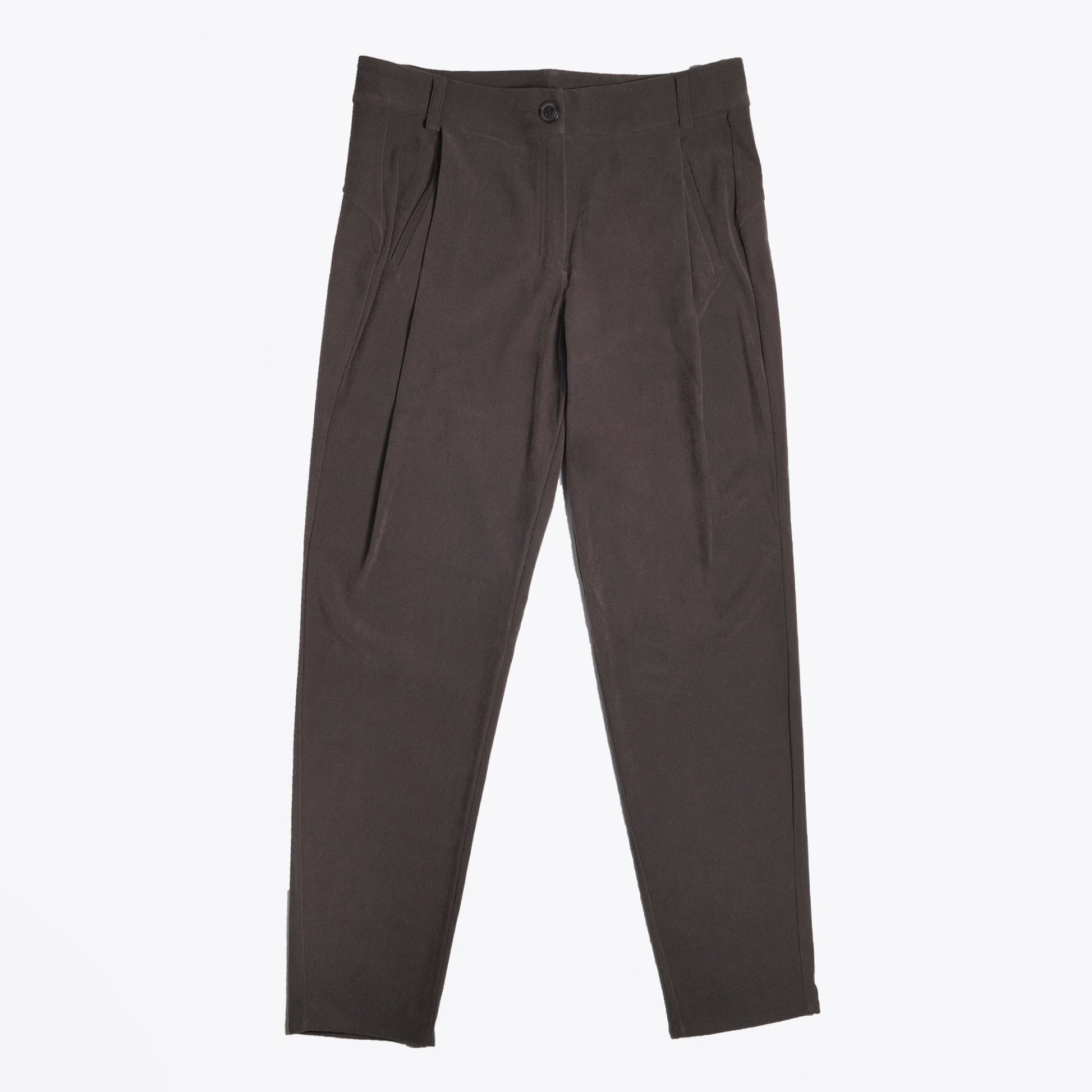 Ania Schierholt conveys contemporary, comfort and practicality in her designs. The flexibility in mixing and matching fabrics and masterfully cut lines complement the female silhouette exquisitely. These pleated trousers are cut in a tapered style and crafted in a super soft fabric blend providing a soft , light velvet handle and comfort and breathability for everyday wear! Features of these pleated trousers include dart pleats on the front, two concealed side pockets, top button and zipper closure, belt loops and topstitching details. Turn up the legs for a more relaxed look and pair with the Ania Schierholt blouse!