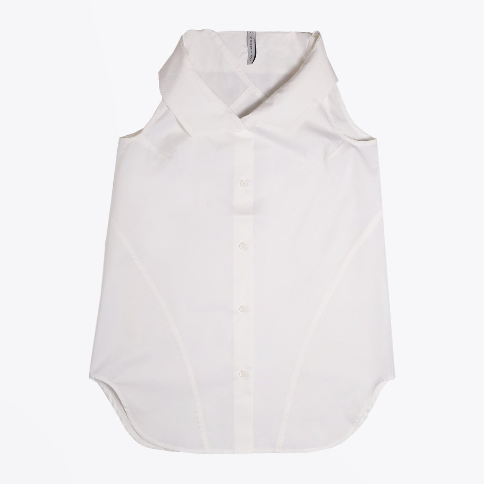 Ania Schierholt conveys contemporary, comfort and practicality in her designs. The flexibility in mixing and matching fabrics and masterfully cut lines complement the female silhouette exquisitely. This classic shirt is crafted in a premium cotton blend with a sporty-style aesthetic. A key feature of this sleeveless shirt are the panelling details and large collar detail. This shirt features a button-down placket, white sheen buttons, curved hemline and topstitching. Team with a pair of Ania Schierholt trousers to complete your look!