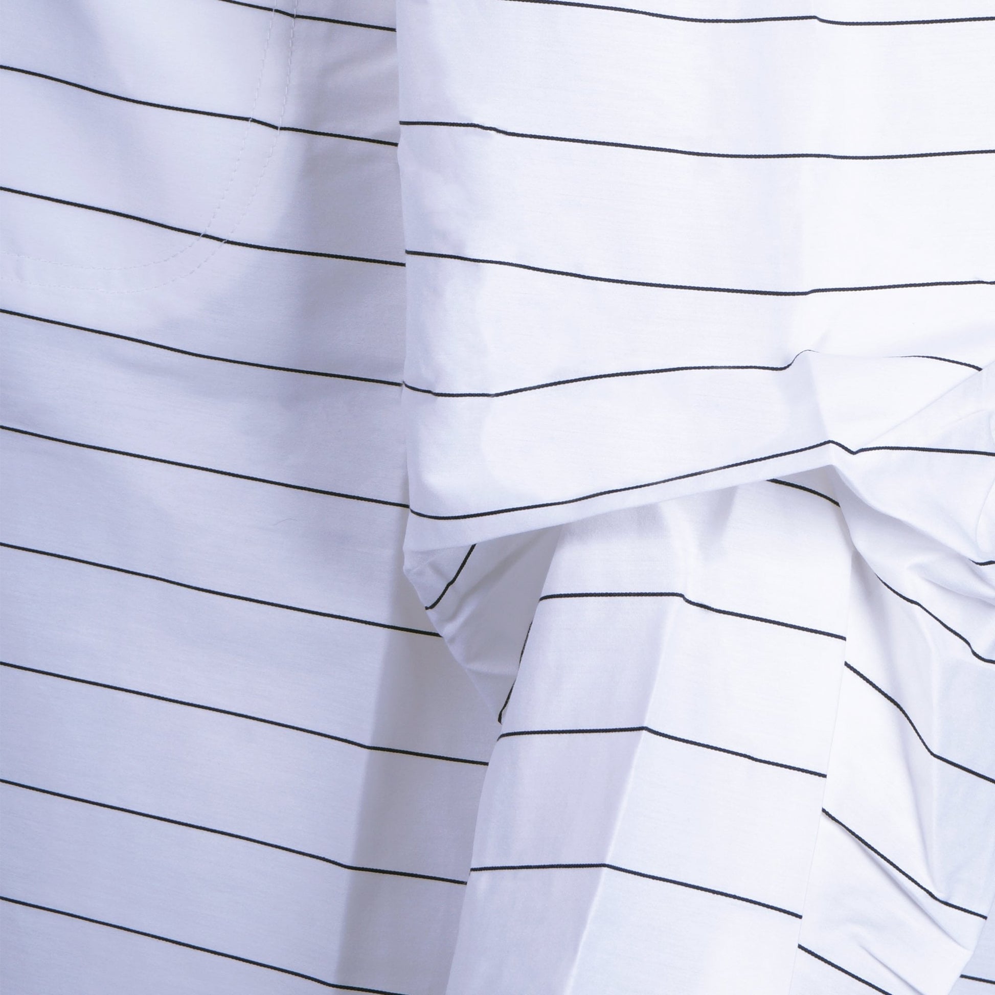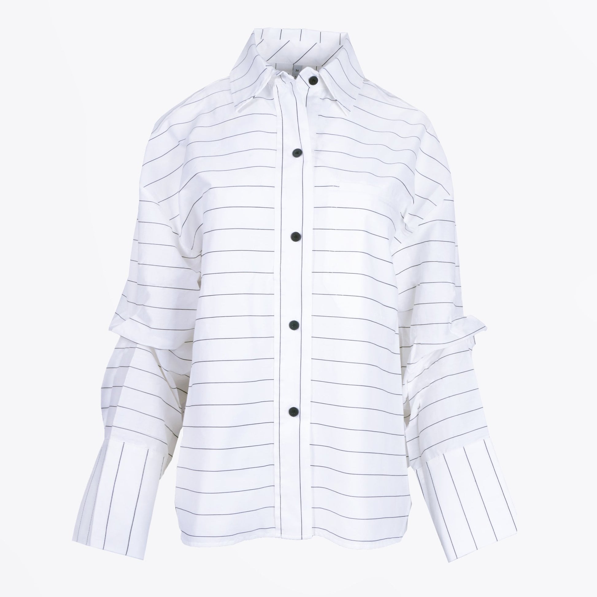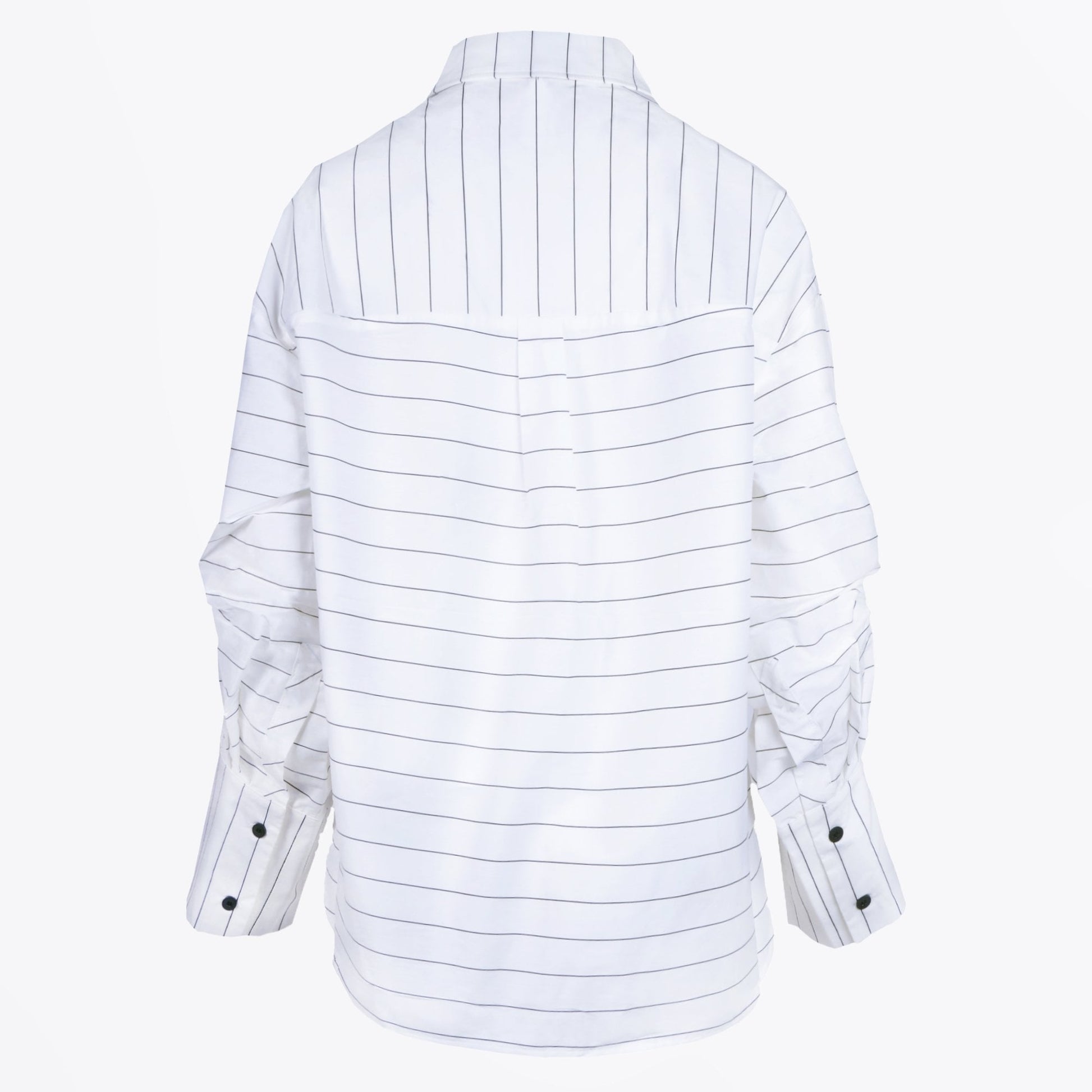 Ania Schierholt conveys contemporary, comfort and practicality in her designs. The flexibility in mixing and matching fabrics and masterfully cut lines complement the female silhouette exquisitely. This shirt is the perfect mix between everyday design and a statement piece. This shirt features statement long sleeves with a sewn tuck, giving the sleeves a permeant rolled up look. This shirt also has a stripped design, with contrasting black buttons and thick cuffs. Wear this shirt with a pair of straight leg pants and heels for a contemporary look.