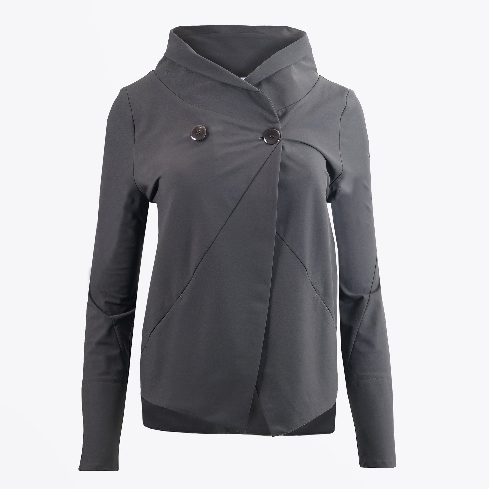 Ania Schierholt conveys contemporary, comfort and practicality in her designs. The flexibility in mixing and matching fabrics and masterfully cut lines complement the female silhouette exquisitely. This contemporary jacket is cut in a slightly loose regular style and crafted in a high-tech fabric providing comfort for everyday wear! Features of this jacket include two side pockets, two button closure on chest and slit detail on each cuff. The finishing touches are topstitching on each cuff. This panelled jacket has a stretchy feel and will take you through autumn into winter!