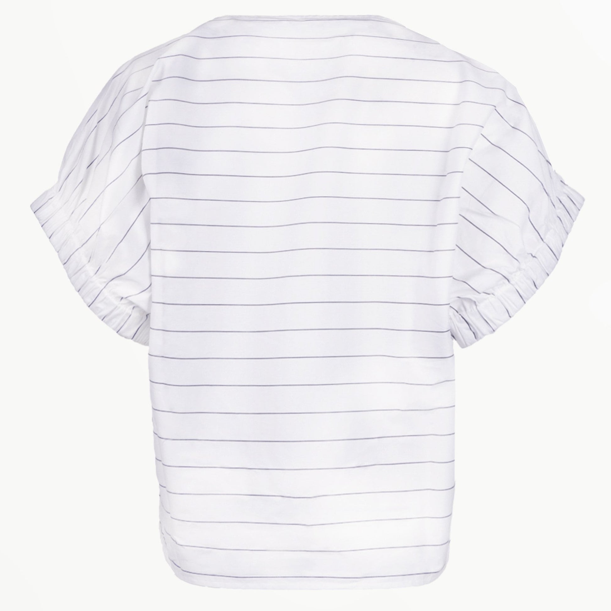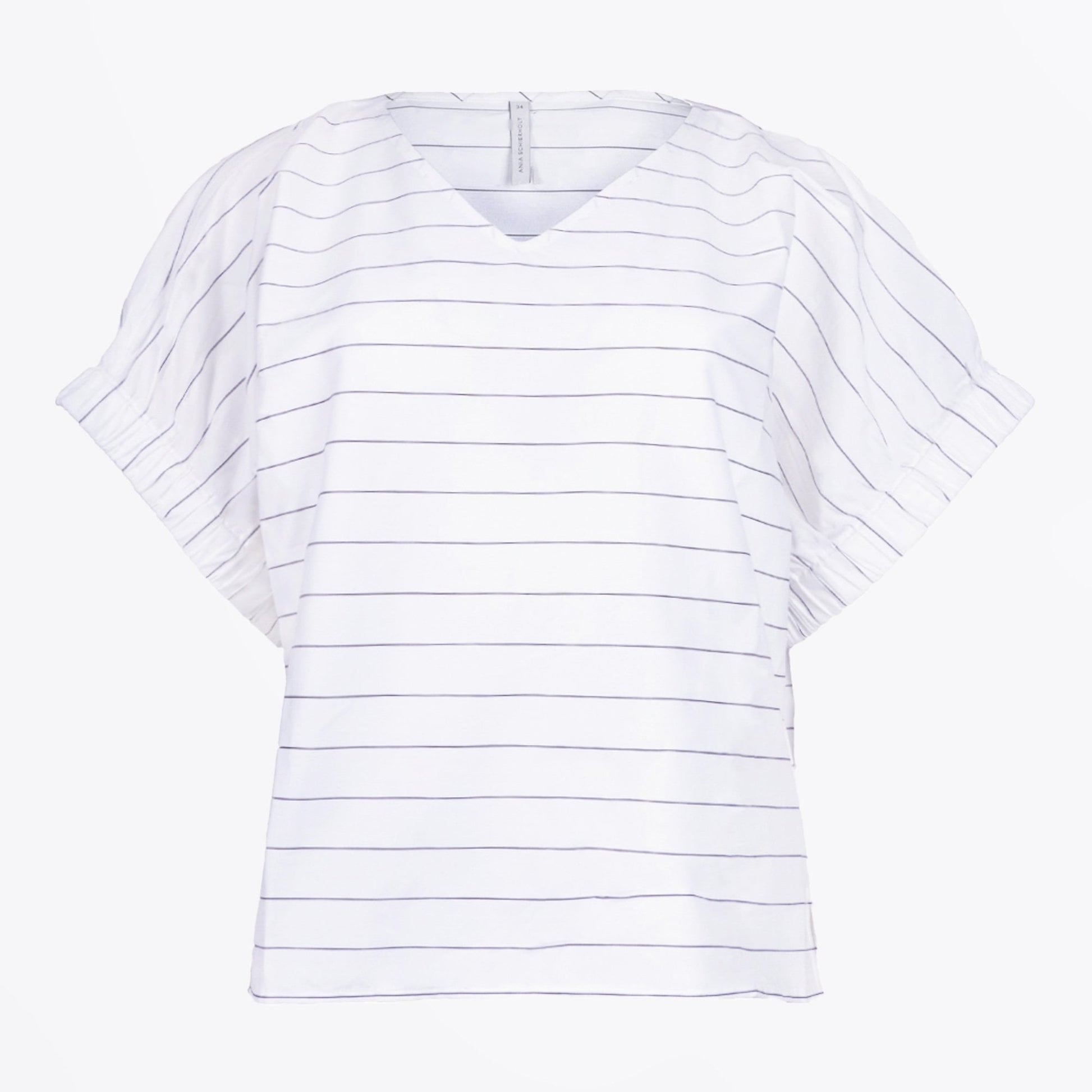Ania Schierholt conveys contemporary, comfort and practicality in her designs. The flexibility in mixing and matching fabrics and masterfully cut lines complement the female silhouette exquisitely. This boxy top is the perfect way to add some designer branding to your casual wardrobe. This top features a vertical stripe design, with seamless short sleeves, and an elasticated cuff. Wear this top with your favourite pair of Paige jeans and some Veja trainers for a cute, casual ensemble.