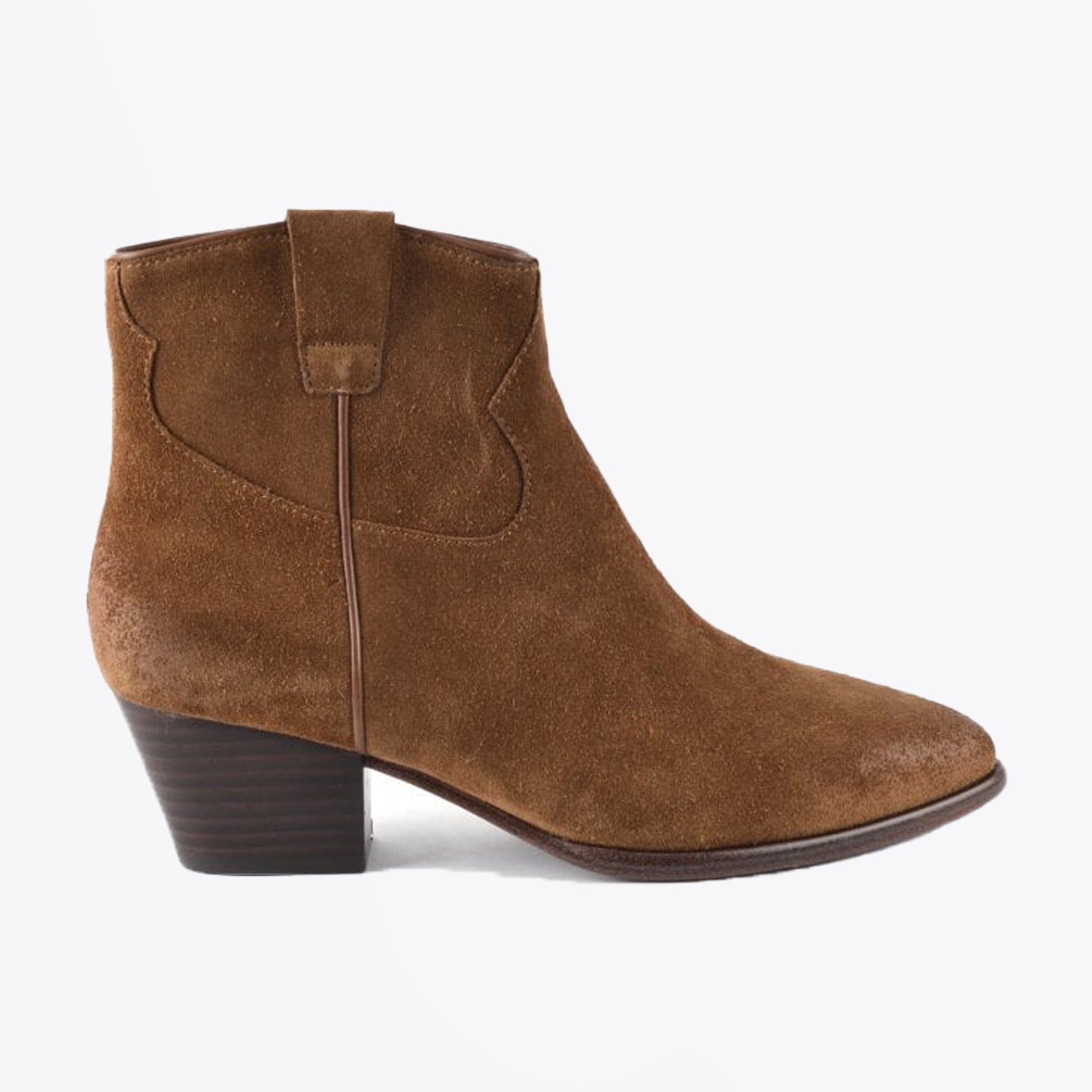 Founded in 2000, Ash footwear combines the knowhow and passion of directors Leonello Calvani and Patrick Ithier. Fusing their creative vision with the finest Italian leathers, Ash shoes embody a lifestyle of music, travel and adventure. They combine high quality Italian leather material with rich French design. Their style is vibrant and sophisticated but practical and comfortable too. Crafted in a soft tan suede with a distressed scuff finish offering that vintage appeal, these boots are fitted with side tabs and piping detailing with inner side zip fastening. Designed with a longer pointed toe and shorter heel. Wear these boots with your favourite designer dress.