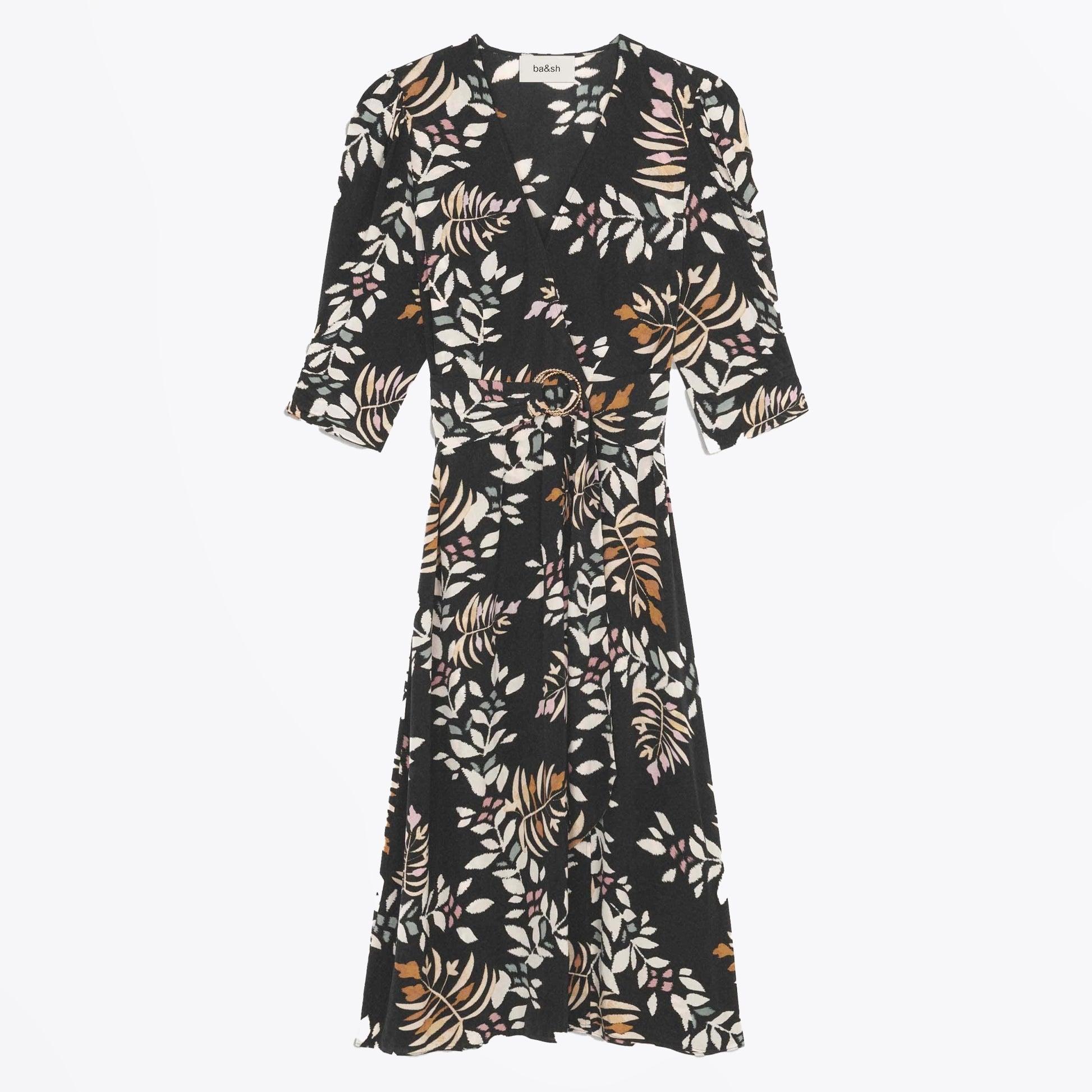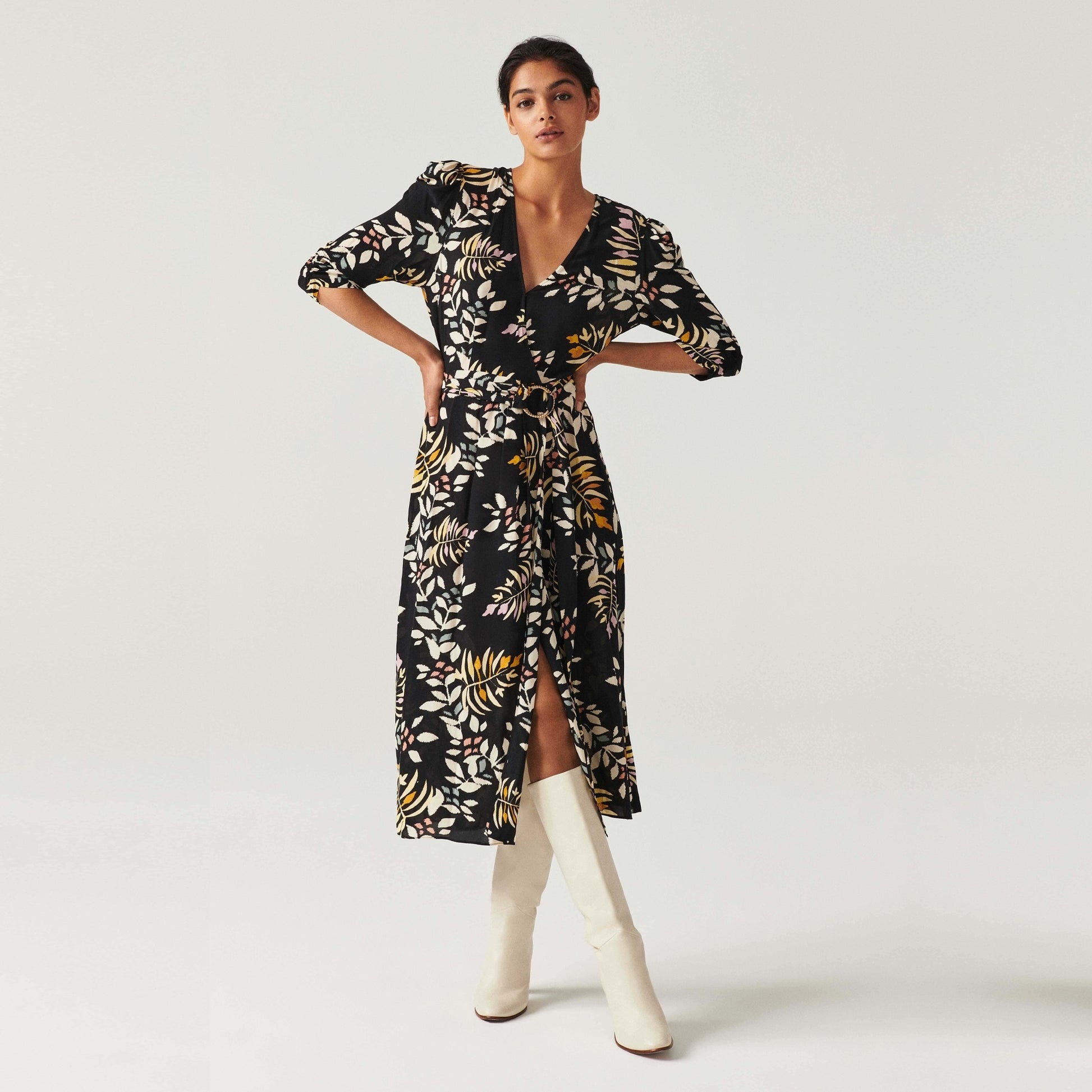 Ba&sh pride themselves on putting women first in the production of clothes, designing pieces that women actually want to wear. Through their designs, they are building a more inclusive society that celebrates all body shapes and sizes. With the perfect autumnal print and effortless aesthetic, this dress is an easy way to add a refinement to your new season wardrobe. Featuring a multicoloured leaf print on a black base, this dress has a wrap-over midi skirt style, with ¾ length sleeves, a v-neckline, and a tied waist. Wear this dress under an Ottod’ame coat and with some leather boots.