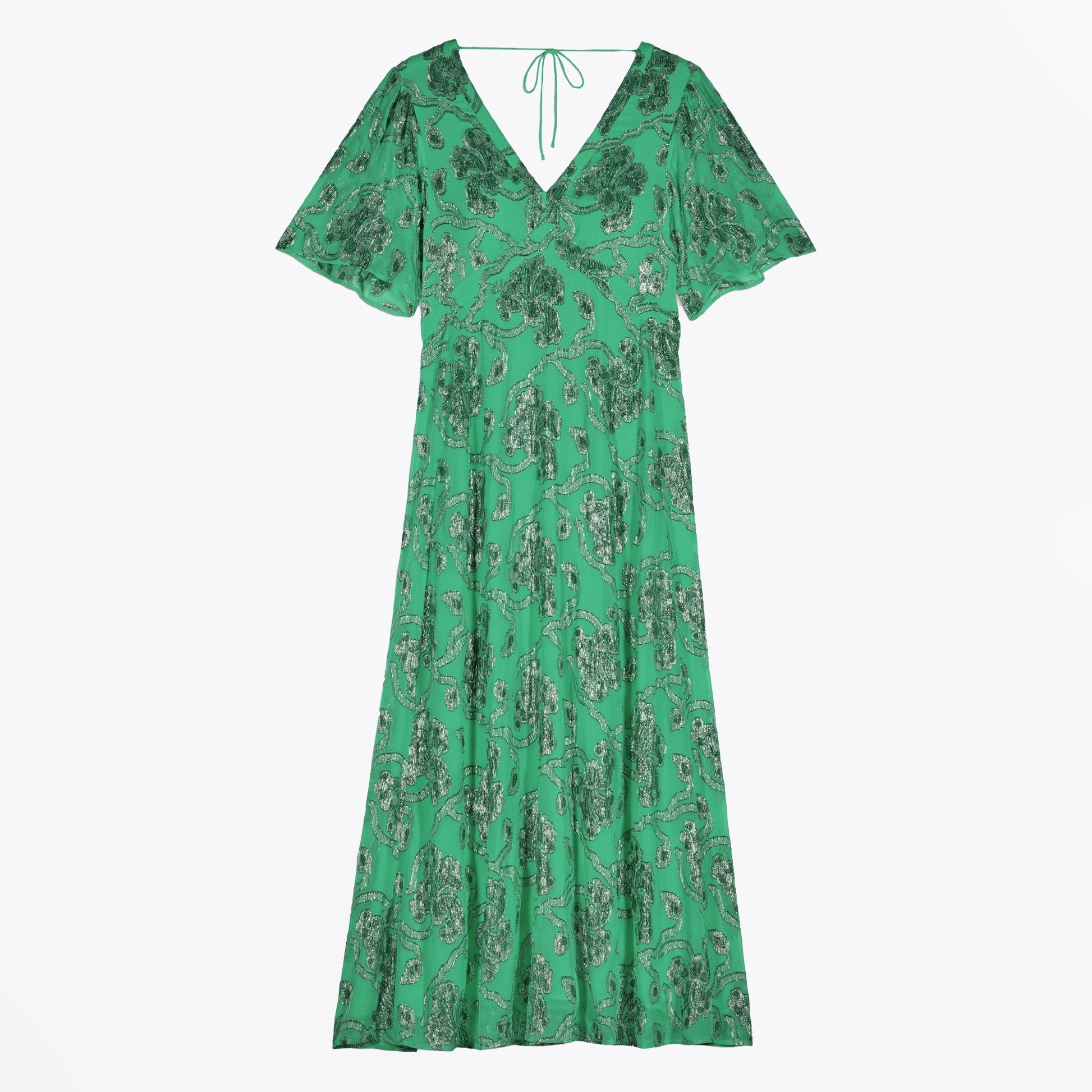 Ba&sh pride themselves on putting women first in the production of clothes, designing pieces that women actually want to wear. Through their designs, they are building a more inclusive society that celebrates all body shapes and sizes. Adding interesting print and a flattering shape to your summer dresses, this dress features a silver floral pattern on a light green base, with angel sleeves, a v-neckline, a low back, and a tie fastening on the back neckline. Wear this with some strappy sandals and an A.P.C. bag.