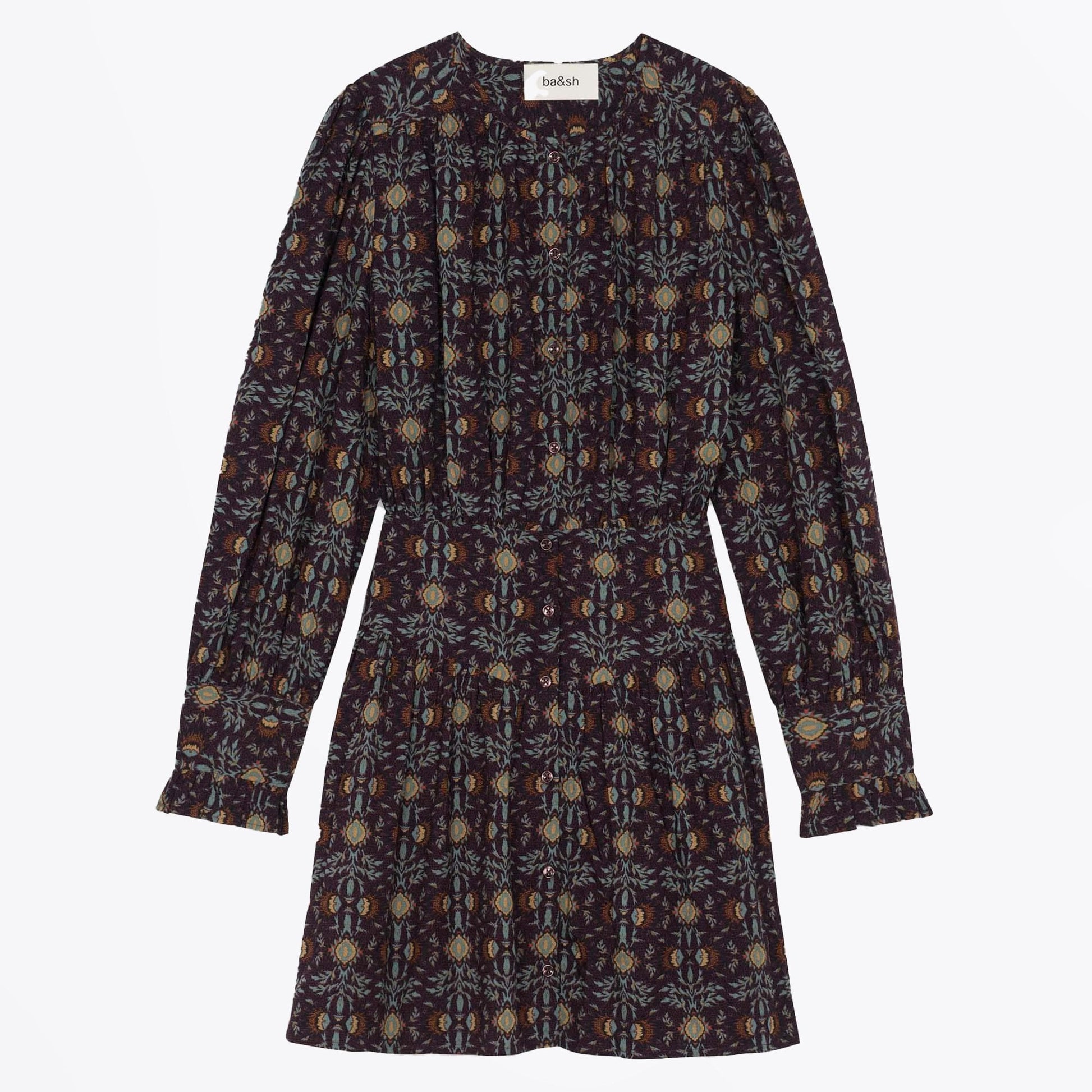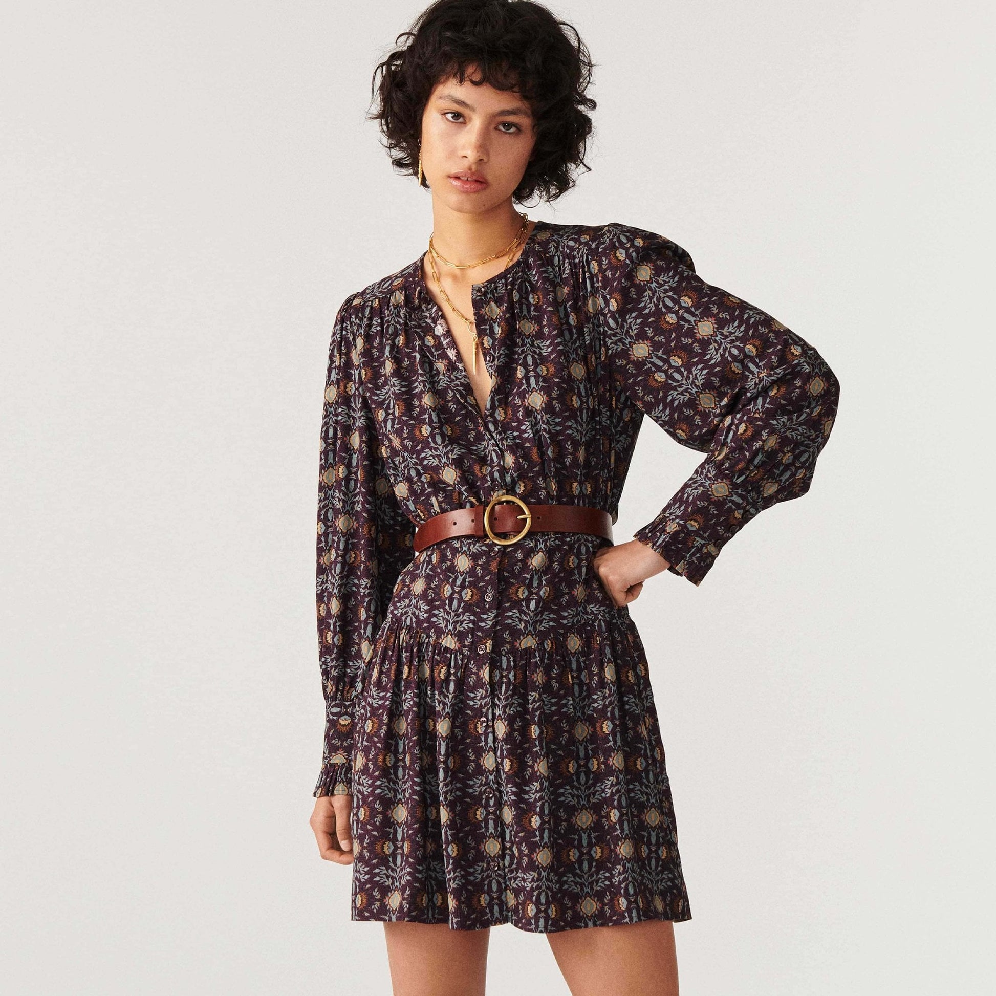 Ba&sh pride themselves on putting women first in the production of clothes, designing pieces that women actually want to wear. Through their designs, they are building a more inclusive society that celebrates all body shapes and sizes. Add some interesting print to your new season wardrobe with a great flowy dress. Featuring a multicoloured botanical inspired print on a burgundy base, this dress has buttoned cuffs with a frill trim, a button-down fastening, and gatherings at the shoulders, waistline, and hip. Wear this dress with some chunky boots and an Ottod’Ame coat.