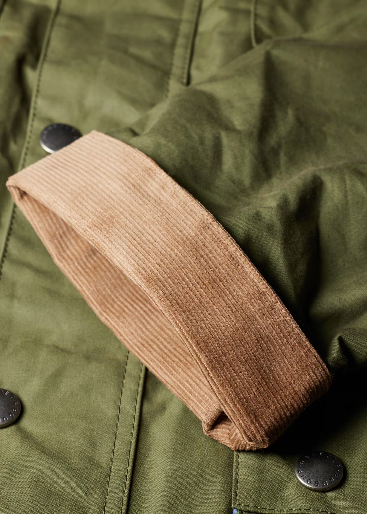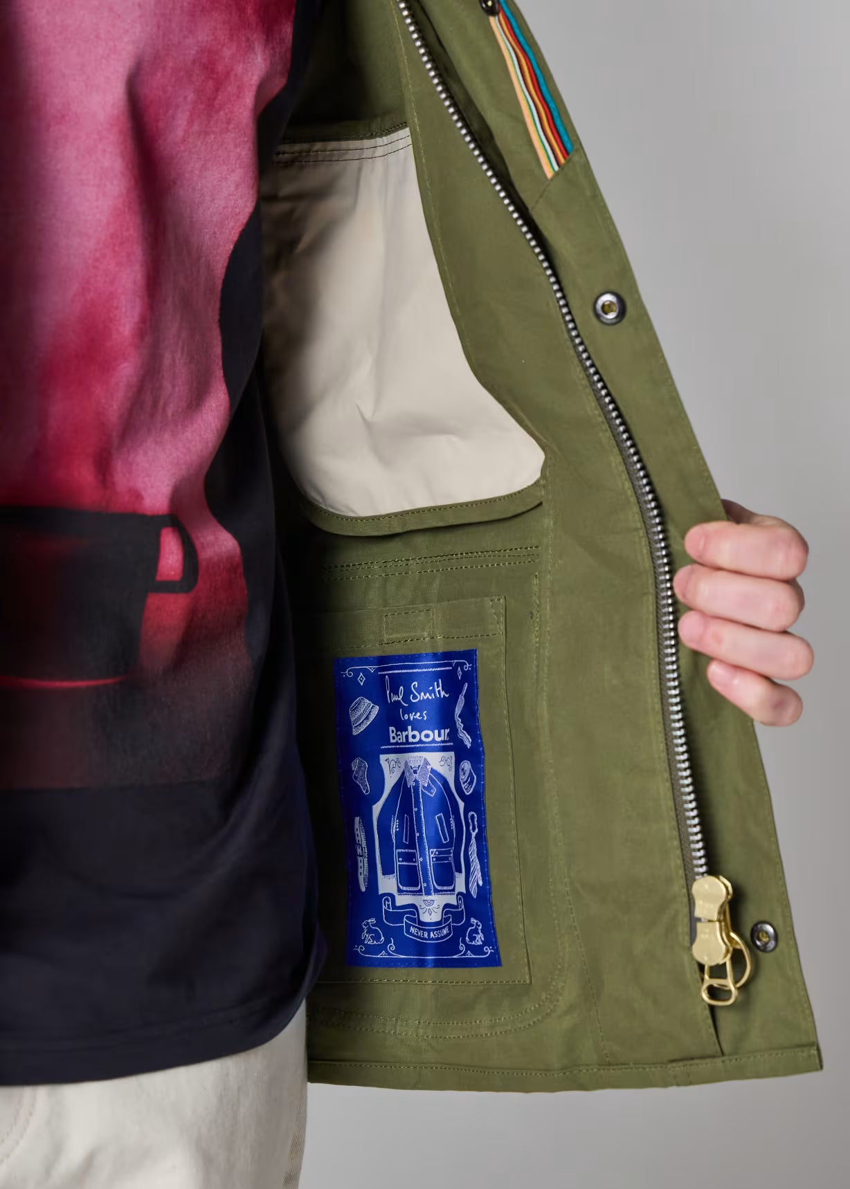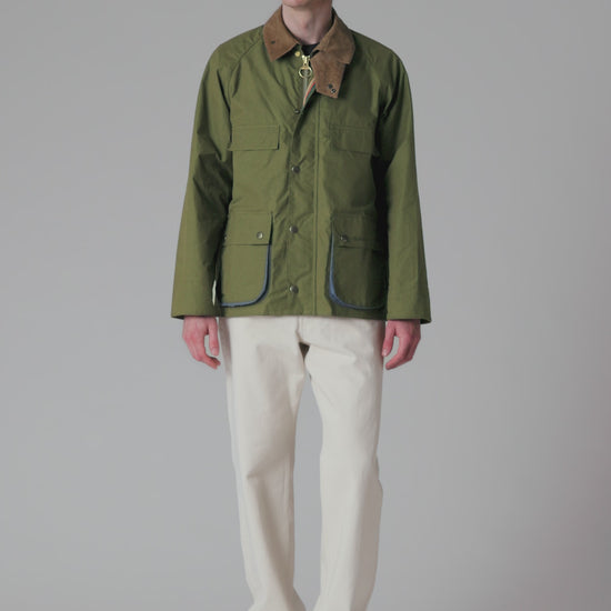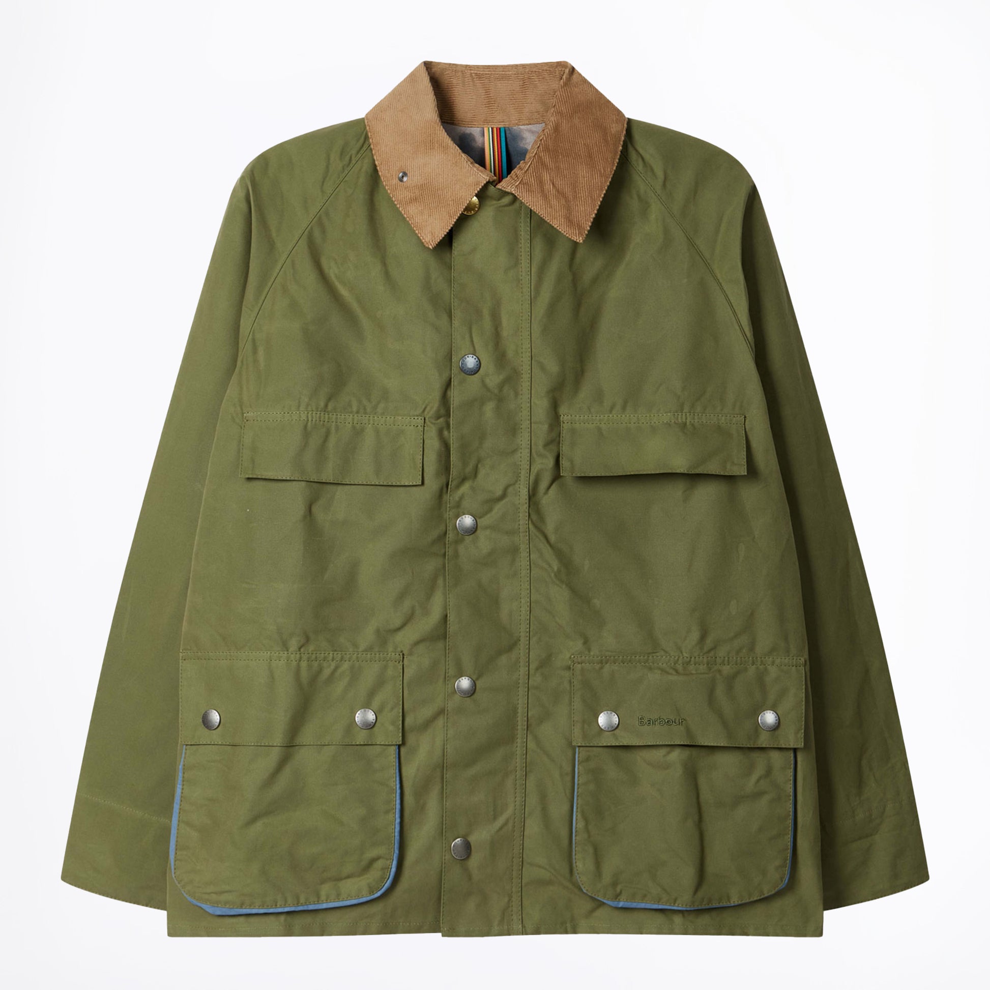This Barbour x Paul Smith collaboration brings together two British heritage brands in a contemporary take on the Bedale silhouette. Crafted from cotton, the casual jacket features a relaxed fit that moves away from traditional fitted shape while maintaining timeless appeal. The signature cord collar adds textural interest, while Paul Smith's distinctive blue detailing provides a modern design flourish that elevates the piece. Perfect for layering through seasons, this Army-coloured jacket bridges smart-casual and everyday wear with understated sophistication.
