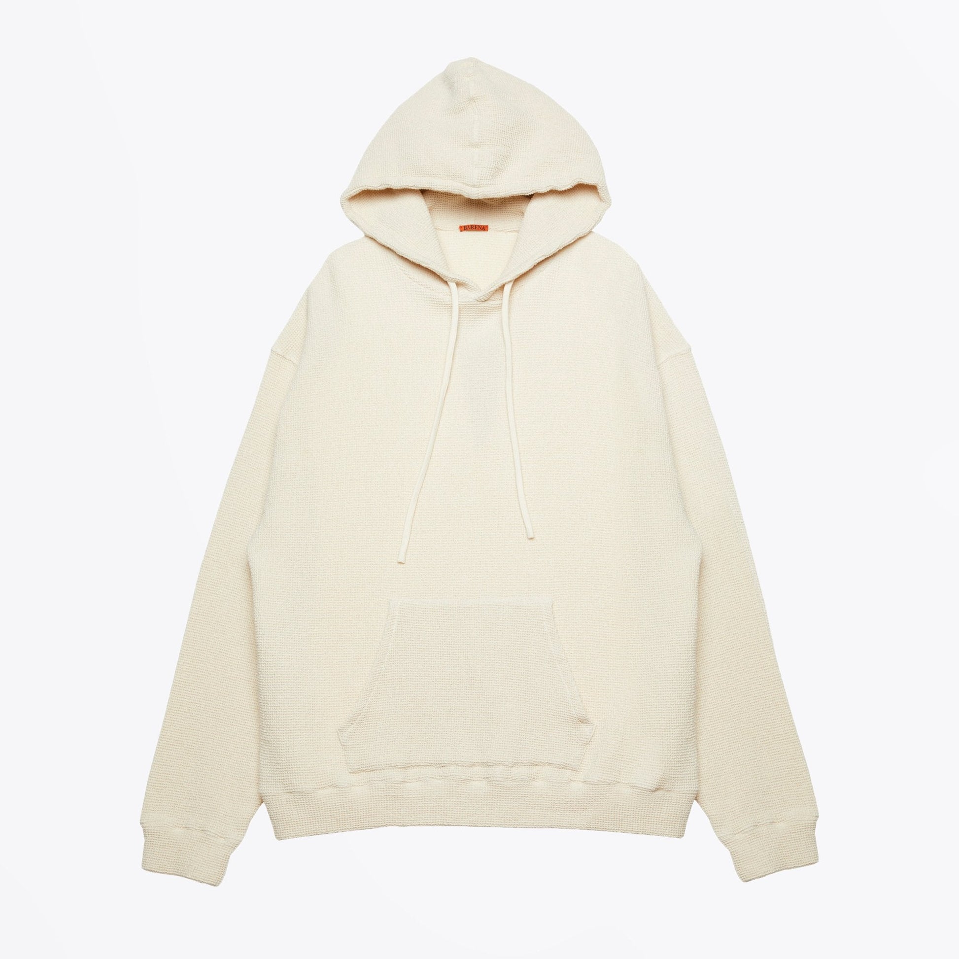 Contemporary designer Barena mimics the qualities of traditional workwear with a modern aesthetic. Precise tailoring, exquisite fabrics, attention to detail and confident versatility are the pillars of the brands philosophy.  This relaxed sweater has a texturized finish and is crafted in a double wafer fabric with slight stretch and is garment dyed. Carrying a sporty aesthetic this chic varsity-style hooded sweater features front pocket and drawstrings to adjust the hood. Pair with relaxed pants to complete your look!