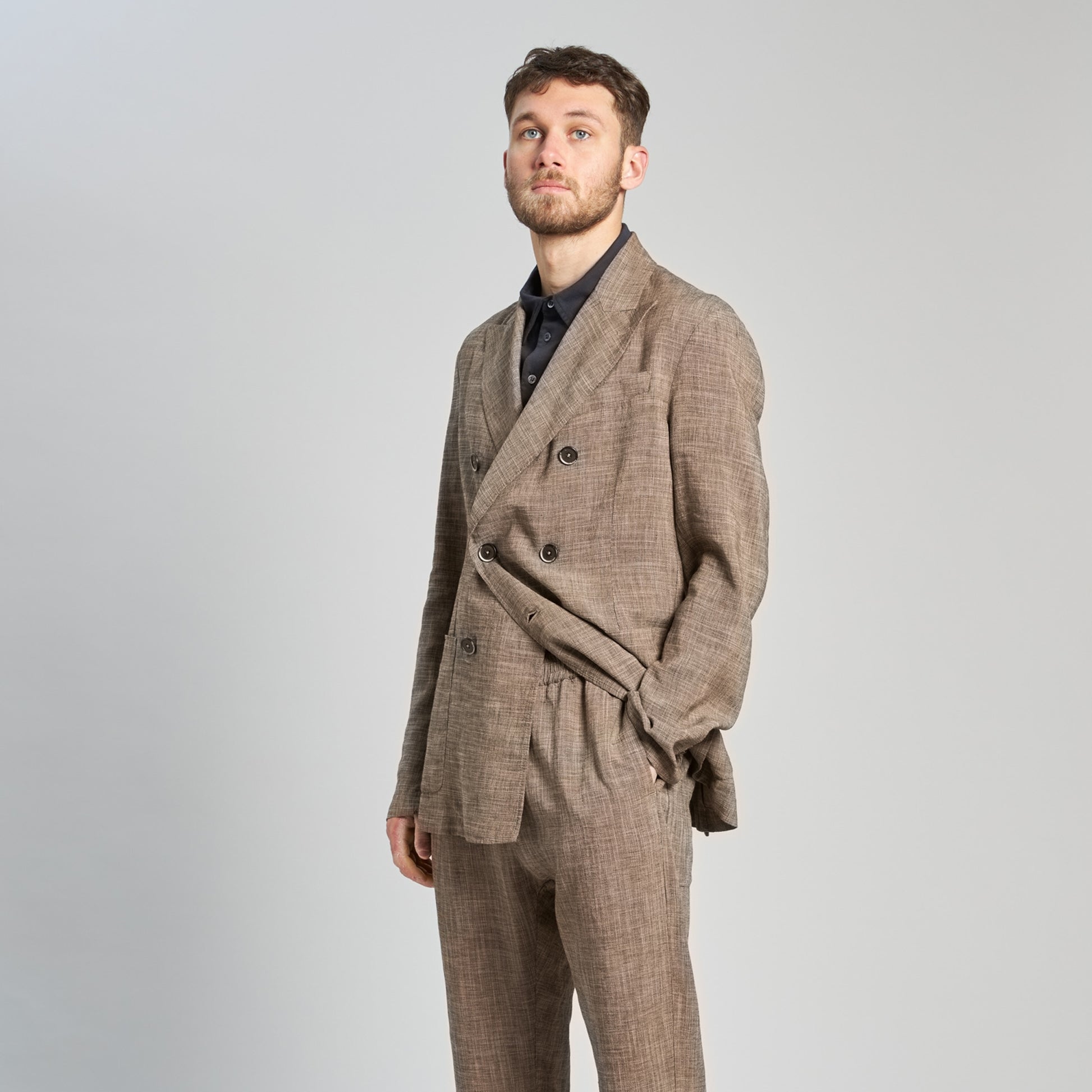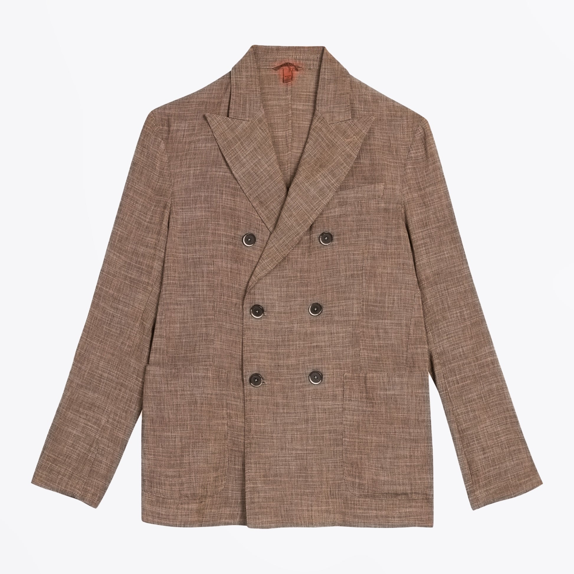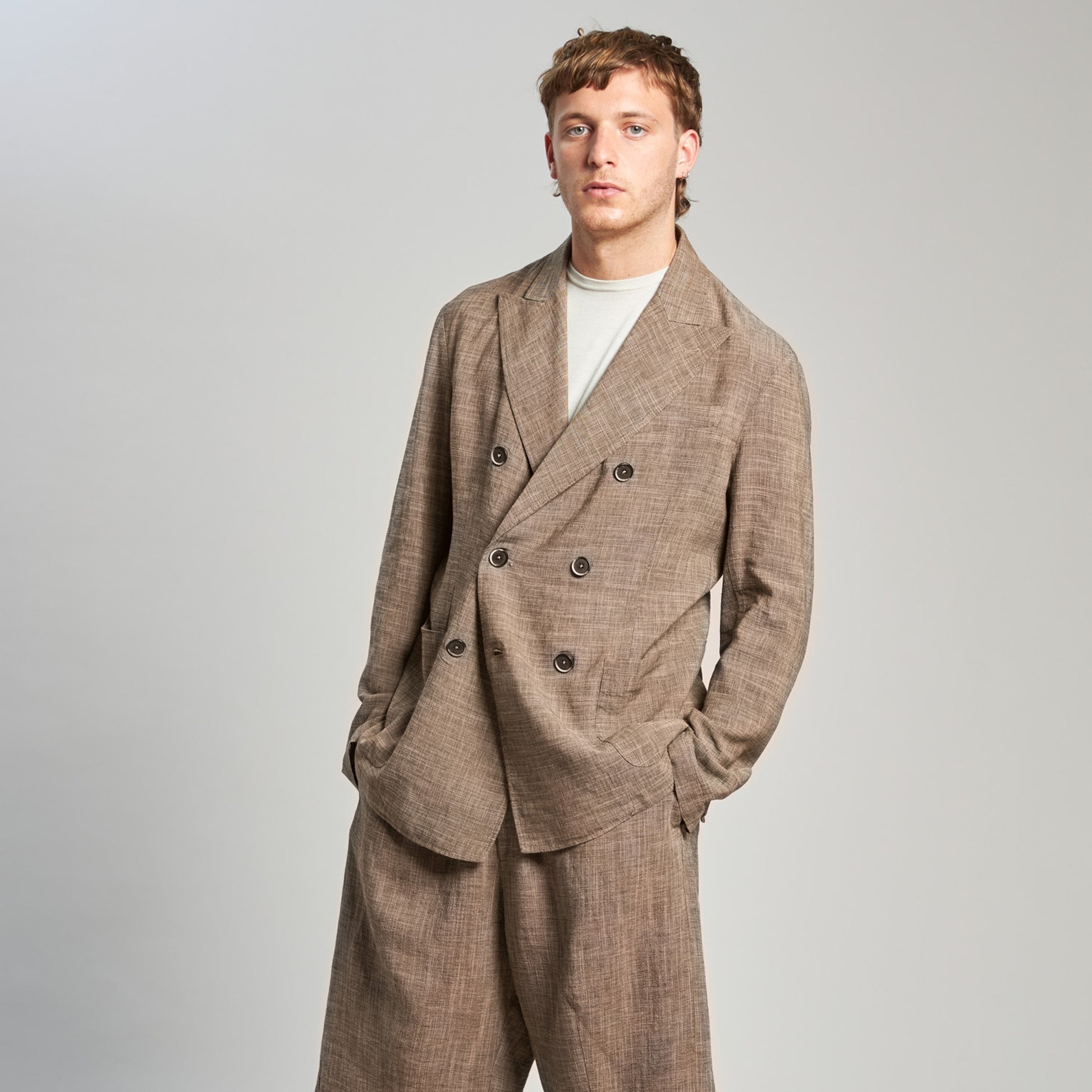 Contemporary designer Barena mimics the qualities of traditional workwear with a modern aesthetic. Precise tailoring, exquisite fabrics, attention to detail and confident versatility are the pillars of the brands philosophy. Crafted in a textured woven material in a brown shade, this double-breasted jacket features a pointed lapel, buttoned cuffs, and two front patch pockets. Easily styled up of down, wear this jacket over a Wax London basic tee and the matching Barena trousers.