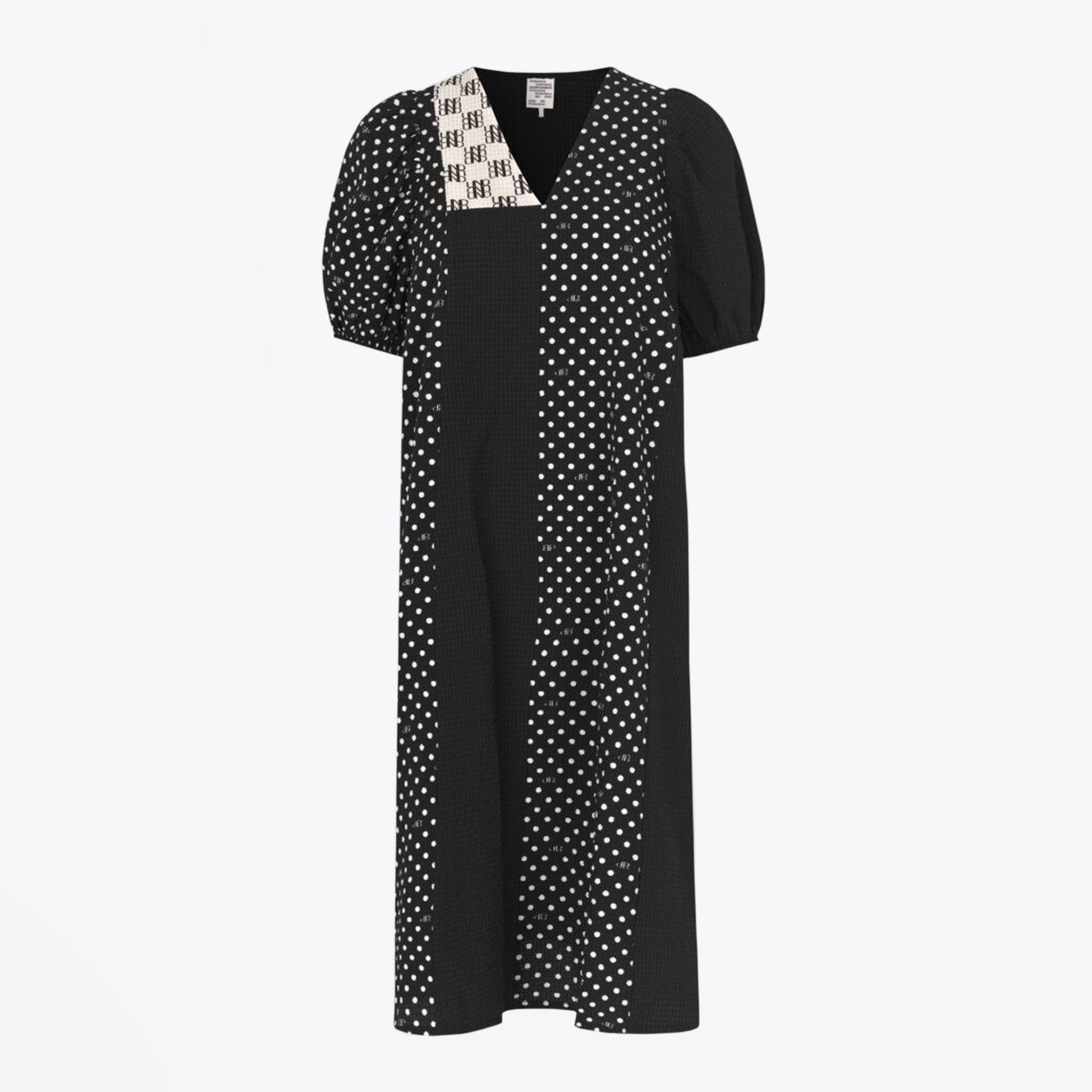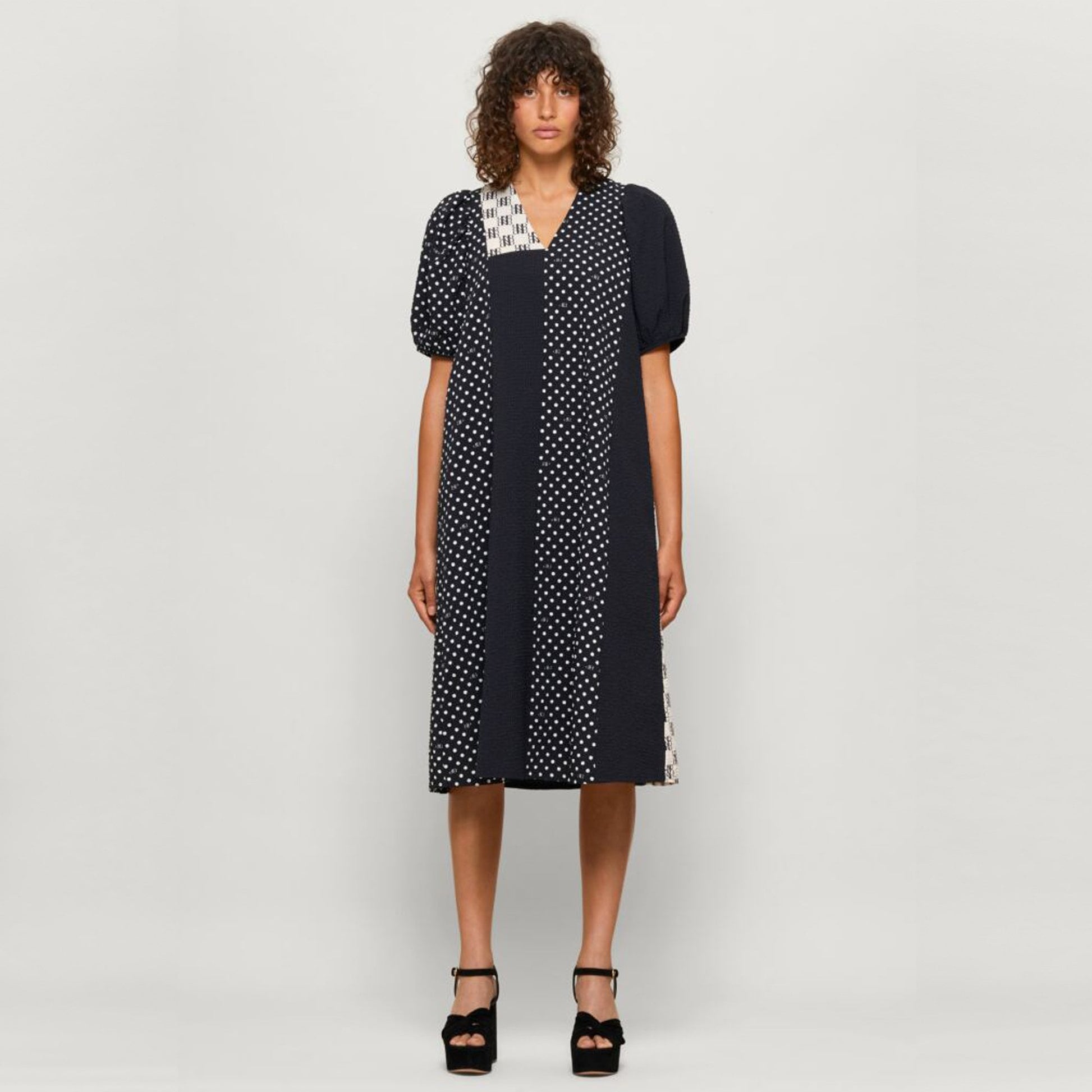 Baum und Pferdgarten is a Copenhagen-based label known for coveted collections embodying an ageless and exclusive approach to clothing and producing beautiful materials, bold colours and striking prints. The Azalia Polka Dot Dress is crafted in a recycled polyester blend. This A-line dress has been designed with v-neck and short puffed sleeves with a chequered seersucker texture. By purchasing this style you are supporting a conscientious and sustainable initiative, fostering the health of our planet.
