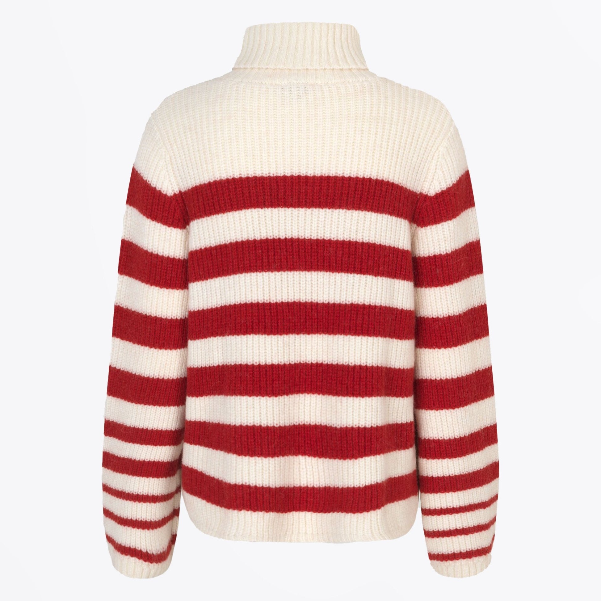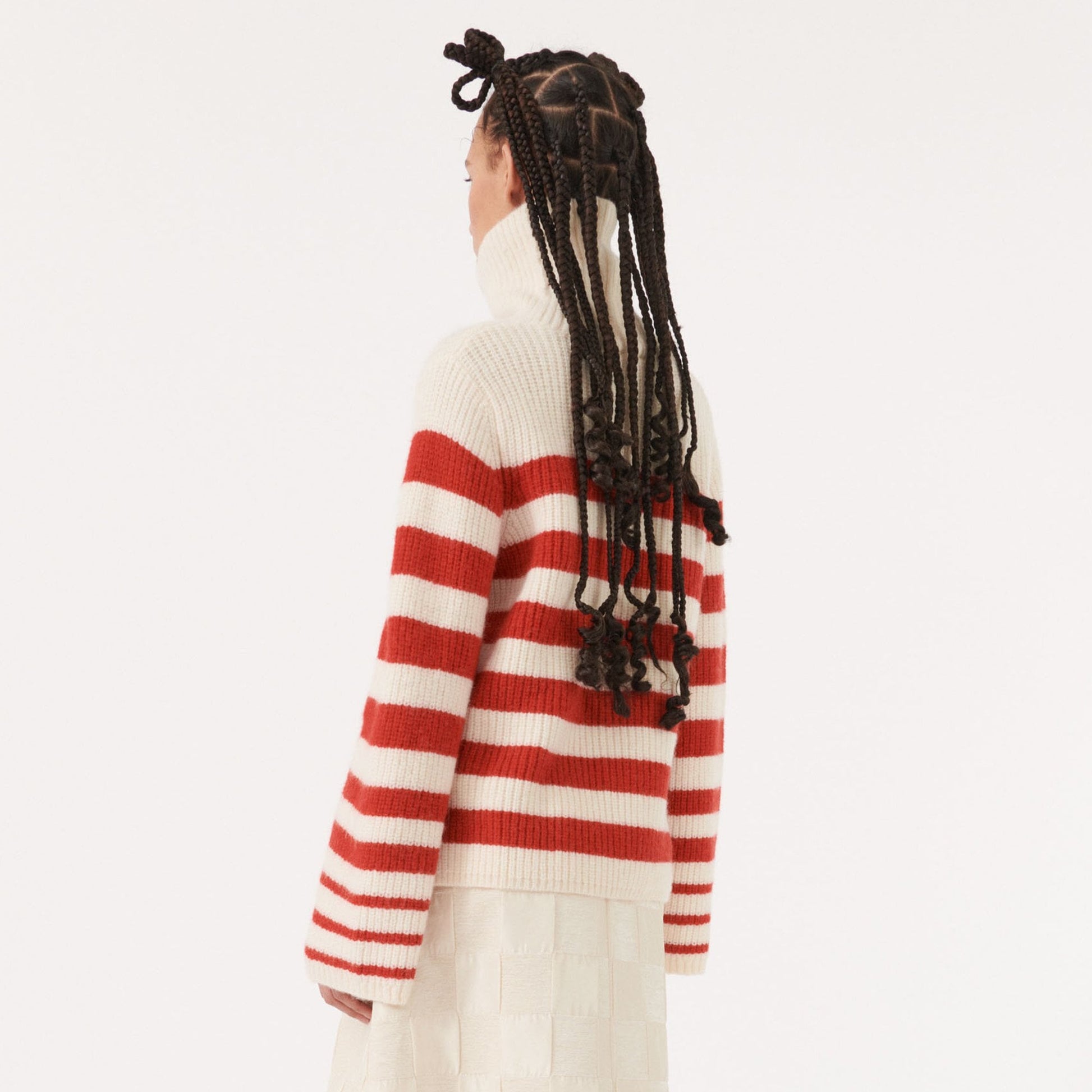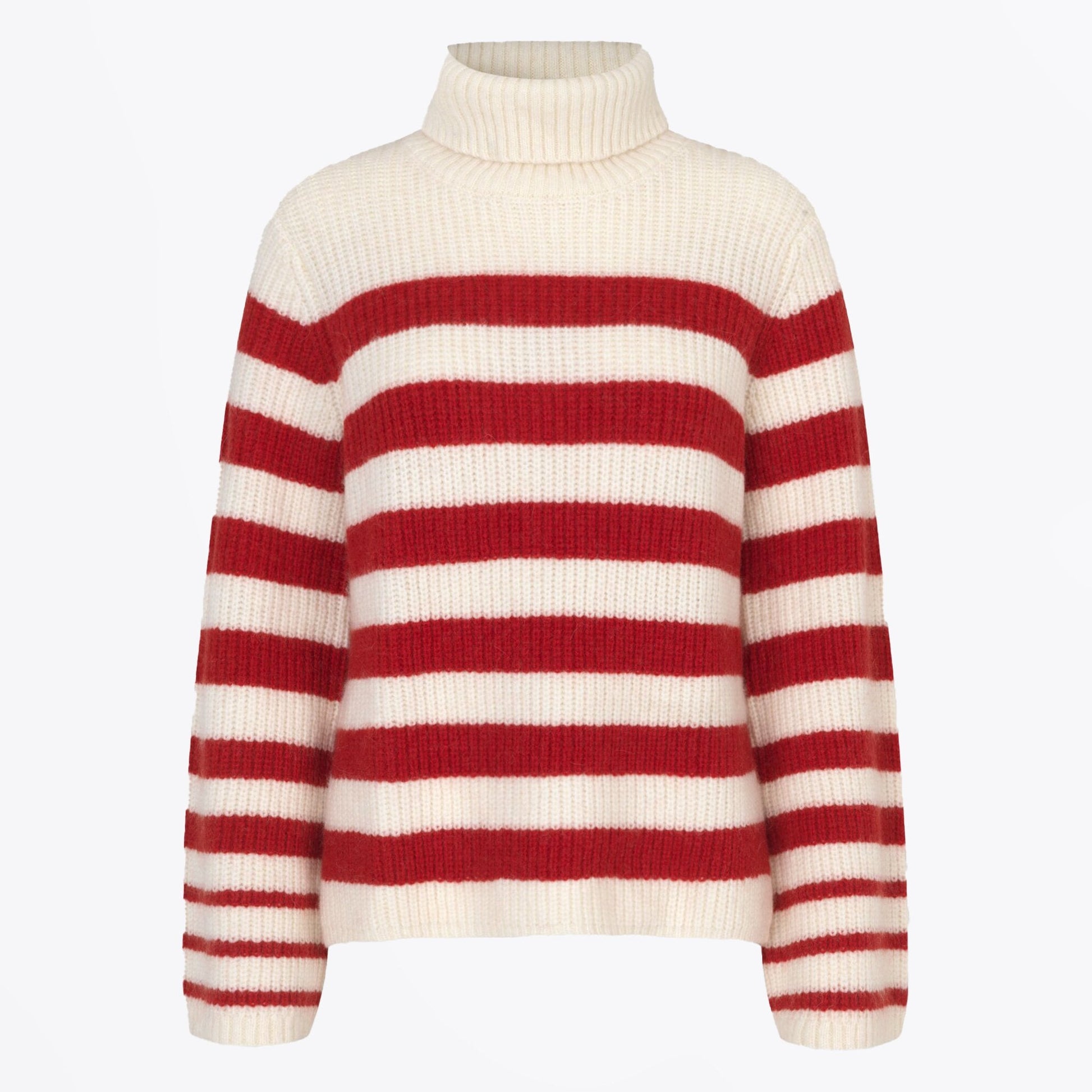 Baum und Pferdgarten is a Copenhagen-based label known for coveted collections embodying an ageless and exclusive approach to clothing and producing beautiful materials, bold colours, and striking prints. Update your new season knitwear with some designer luxury. Featuring a red stripe design, this chunk knitted jumper has a high ribbed neckline with wide sleeves and side slits. Wear this jumper with a pair of designer jeans and some heeled boots.
