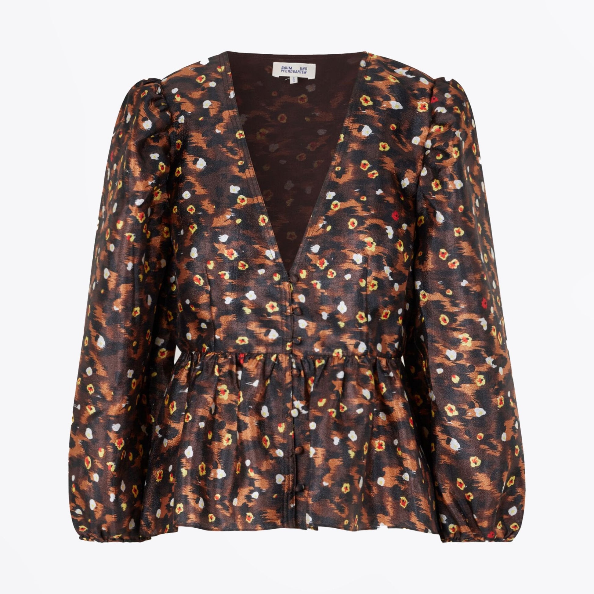 Baum und Pferdgarten is a Copenhagen-based label known for coveted collections embodying an ageless and exclusive approach to clothing and producing beautiful materials, bold colours, and striking prints. Add some interesting patterns to your winter wardrobe with this top from Baum und Pferdgarten. This blouse is crafted with a brown toned floral print, and features a fitted upper body with a frill, full sleeves, a v-neckline, and elasticated cuffs. Wear this top with a pair of designer jeans and some heeled boots.