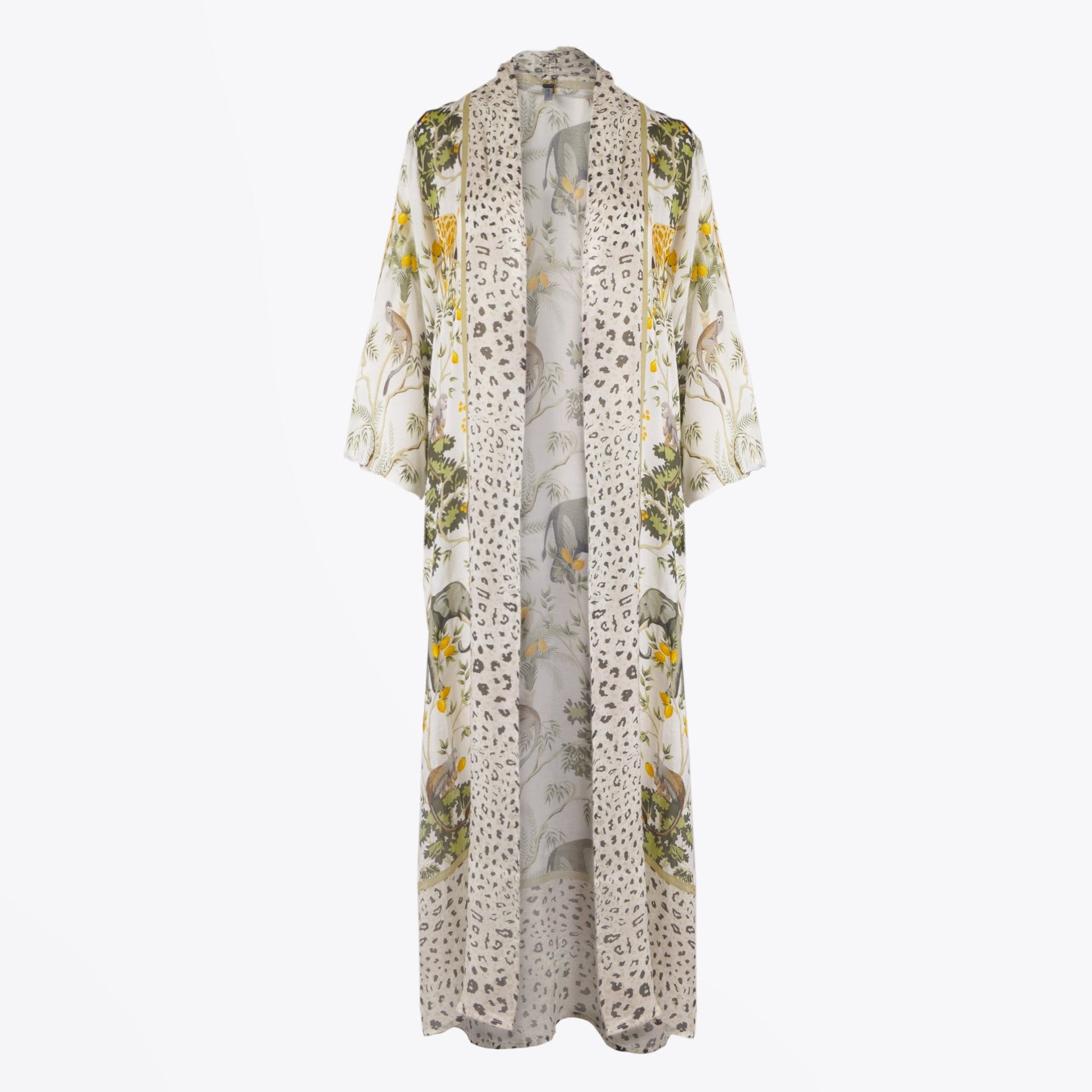 Blank is a truly unique collection of beautifully crafted day to night pieces.This stunning maxi-length animal print coverup is a perfect statement piece for your summer wardrobe. Muted greens and yellow blend together on a beautiful background hemmed with abstract spots. This lightweight coverup features 3/4 length sleeves and slits on either side. Effortless breezy chic in combination with a white t-shirt, short military shorts and gladiators or favourite trainers. Even works layered with something a little warmer for transitional months. Of course, when the occasion arises again the coverup also works great over a bikini for a beach to bar combo.