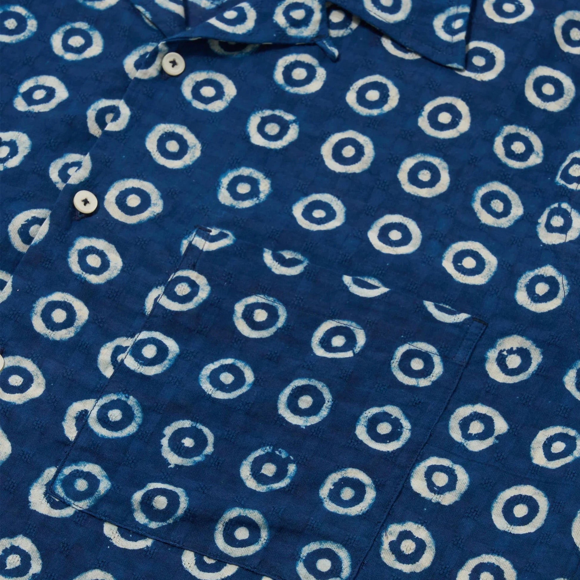 Block-printed circles dance across premium cotton in rich indigo, creating a timeless pattern with authentic artisanal character. This camper shirt features a relaxed open collar and breathable fabric ideal for warm weather layering or standalone wear. The natural block-print variation ensures each piece is uniquely detailed, while the light cotton construction promises comfort.