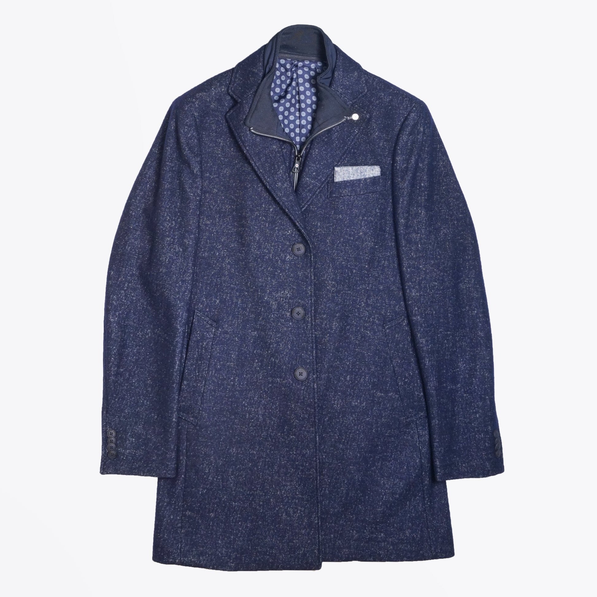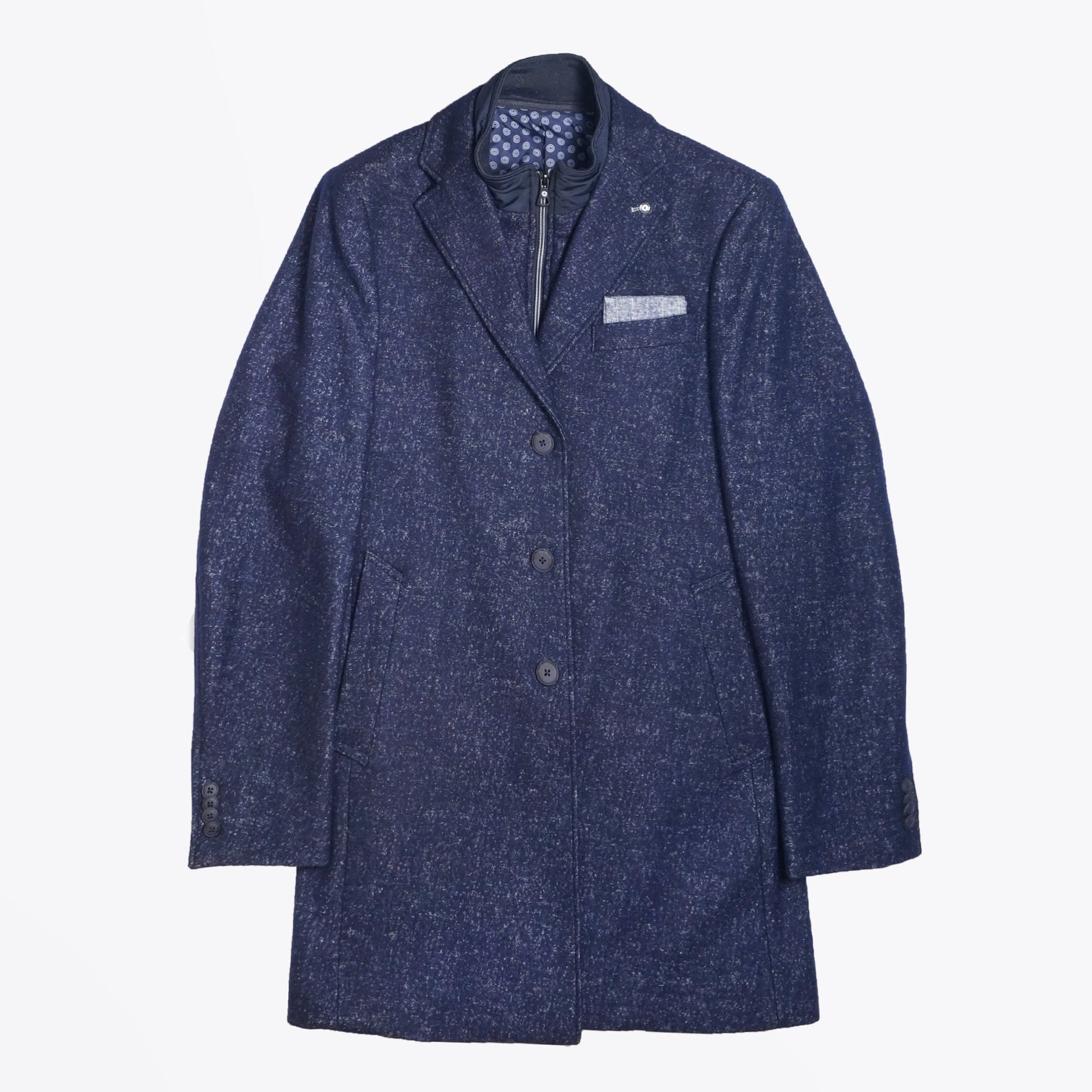 Blue Industry is an on-trend Dutch brand that designs distinguished casual pieces. The high quality fabrication of their clothing is apparent in their attention to detail. This Navy Speckled Overcoat is traditionally tailored for the perfect comfortable fit. This timeless piece features a removable internal gilet with a zip fastener and elasticated around the neck, a chest pocket with pocket square, 2 side pockets and 3 button closure. The finishing touches include two inside pockets, back vent and 4 button closure at the cuff. This coat is also lined. Blue Industry badge on lapel. A perfect piece of outerwear for the Autumn/Winter season!