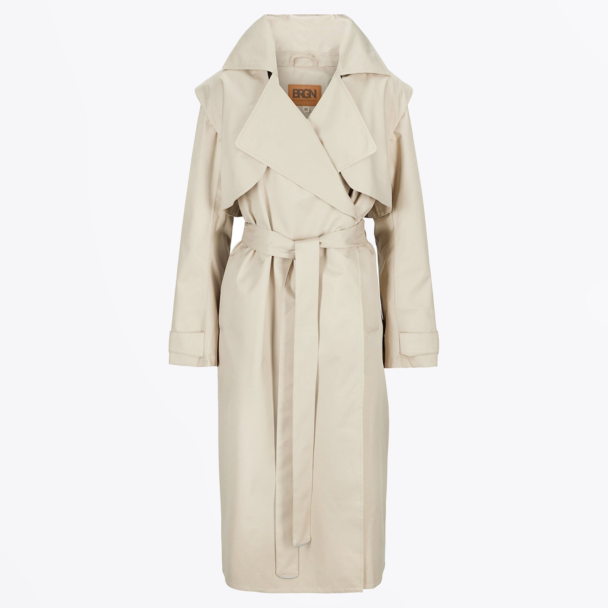 Introducing the AW 24 season of BRGN. The brand is a Norwegian brand founded in 2015 in the city of Bergen the rainiest city in Europe which inspired the brand to focus on Rainwear attire. The brands’ goal is not to compromise fashion for functionality, providing modern urban high quality and waterproof outerwear. This Regndrape trench coat features a waterproof material, lapel collar, removable hood under collar, side welt pockets, magnetic closure, hidden zip fastening, waist tie in a subtle sand colour. Wear this coat with any of your favourite designer outfIts.