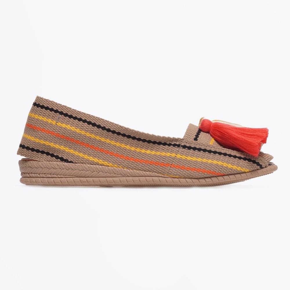The espadrille shoe is Casa de Vera 's strong point, adding colour and life into the timeless summer style. This particular pair in a camel multi-coloured weave feature pale pink, cream and gold coloured tassels on the toe.