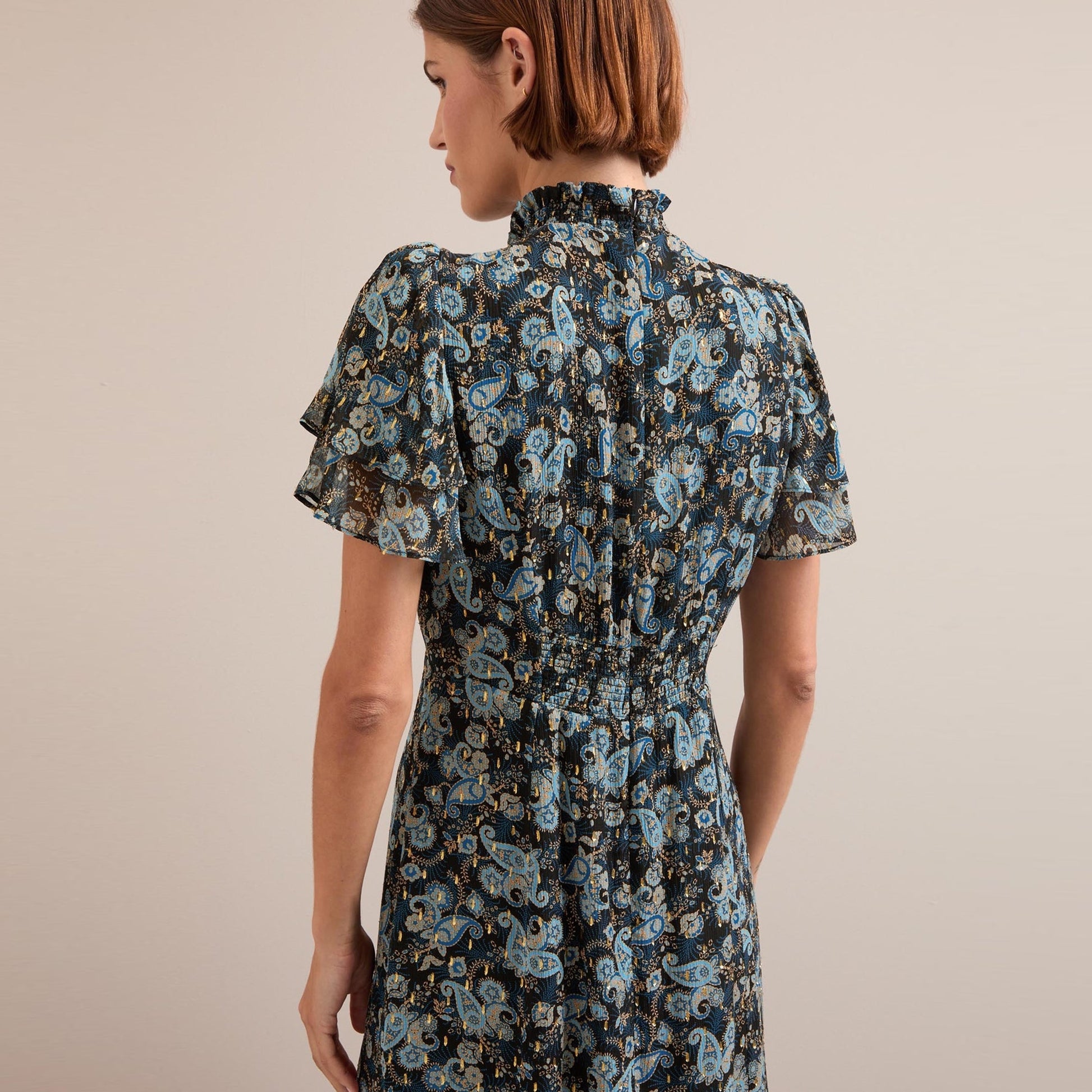 Modern design steeped in elegance and femininity, Cefinn’s contemporary style is all about creating unique pieces that are versatile and eternal. Founded by Samantha Cameron in 2017, this young brand has been designing clothing that allows women to feel effortlessly fashionable Add some effortless elegance to your dresses with this Cefinn Aurelia dress. This dress features a beautiful navy colour, with a Paisley design throughout, rounded frill neckline, gold fil coupe detailing for a winter sparkle and shirred waist. Style with some Mexicana boots.