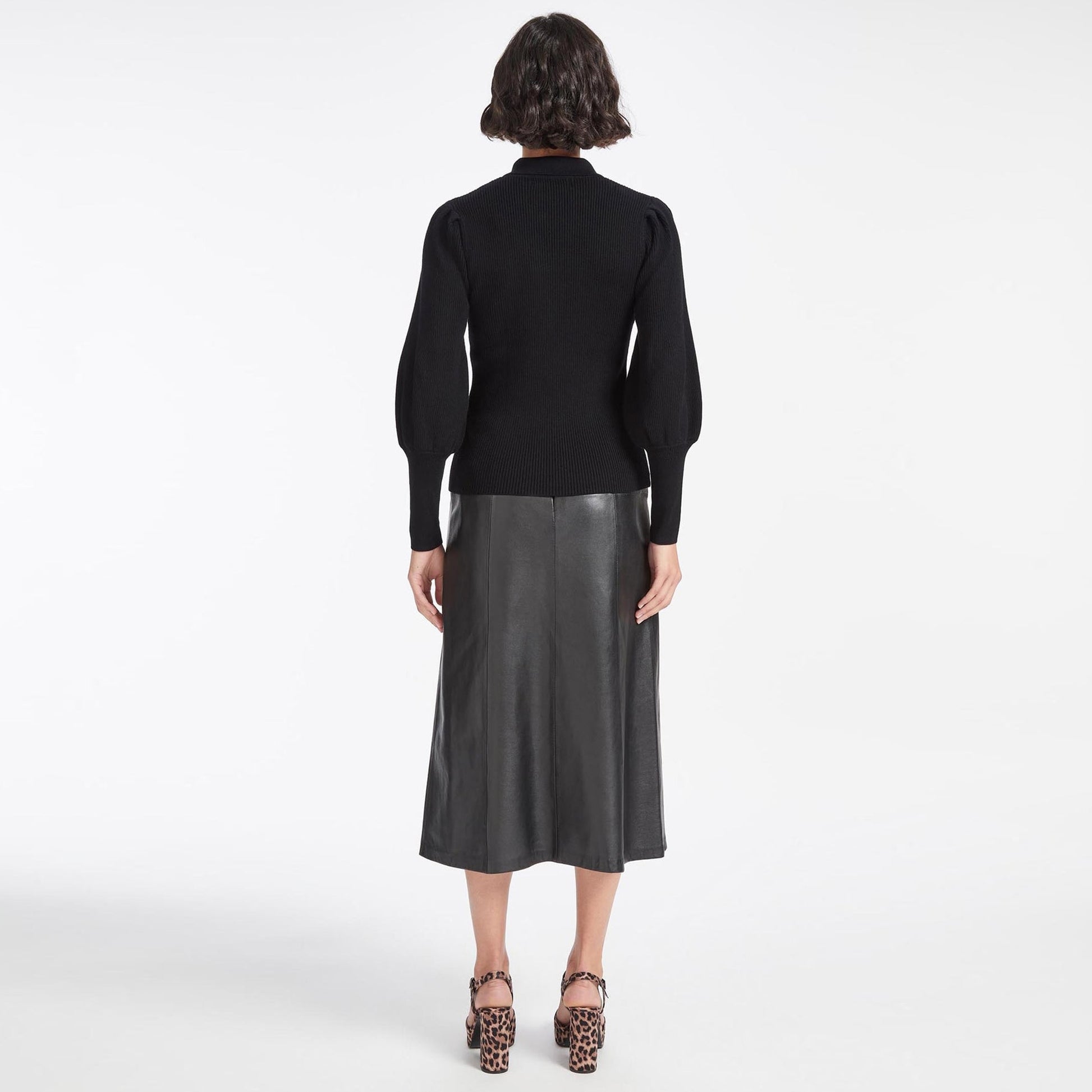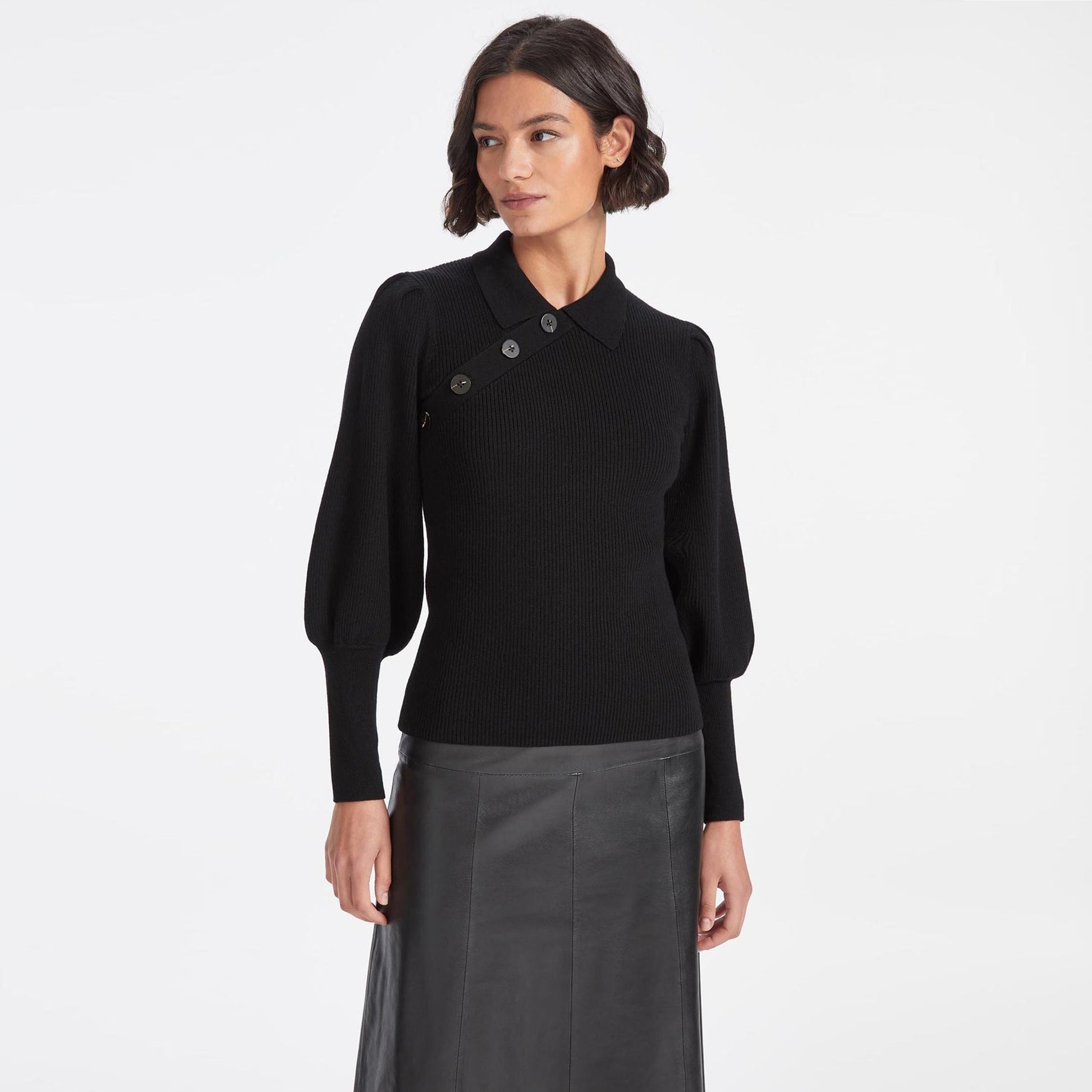 Modern design steeped in elegance and femininity, Cefinn’s contemporary style is all about creating unique pieces that are versatile and eternal. Founded by Samantha Cameron in 2017, this young brand has been designing clothing that allows women to feel effortlessly fashionable. Elevate your knitwear with a luxury yarn and contemporary style. Crafted from a merino wool, this top features bell sleeves, with a collared neckline with an asymmetric placket, and ribbed cuffs. Style this top with the Cefinn leather skirt and some strappy heels.