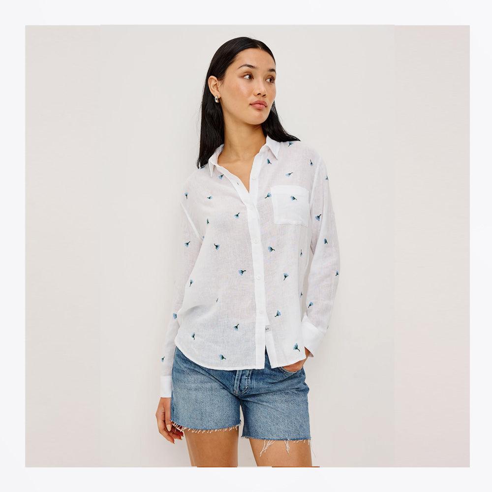 Crafted from a breathable linen blend, the Rails Charli Shirt combines relaxed, roomy proportions with delicate bluebell embroidery for understated elegance. Long sleeves and a button-up front deliver versatile layering potential. A refined essential that transitions seamlessly across seasons.