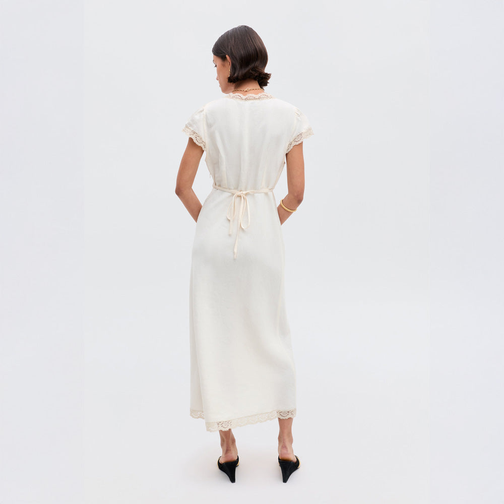 The Clarice midi dress brings vintage-inspired elegance to your summer wardrobe. Crafted from breathable viscose linen, this cream piece draws inspiration from classic nightdress design, featuring delicate lace detailing and charming rose trim. The flattering silhouette combines a V-neck that accommodates a bra, cap sleeves, and an empire waist with adjustable tie for a customised fit. A concealed side zip ensures a seamless finish, while the signature bias cut and unlined construction provide comfort without restriction. Available in regular and petite sizes, it fits true to size. Perfect for warm-weather occasions where understated sophistication matters.