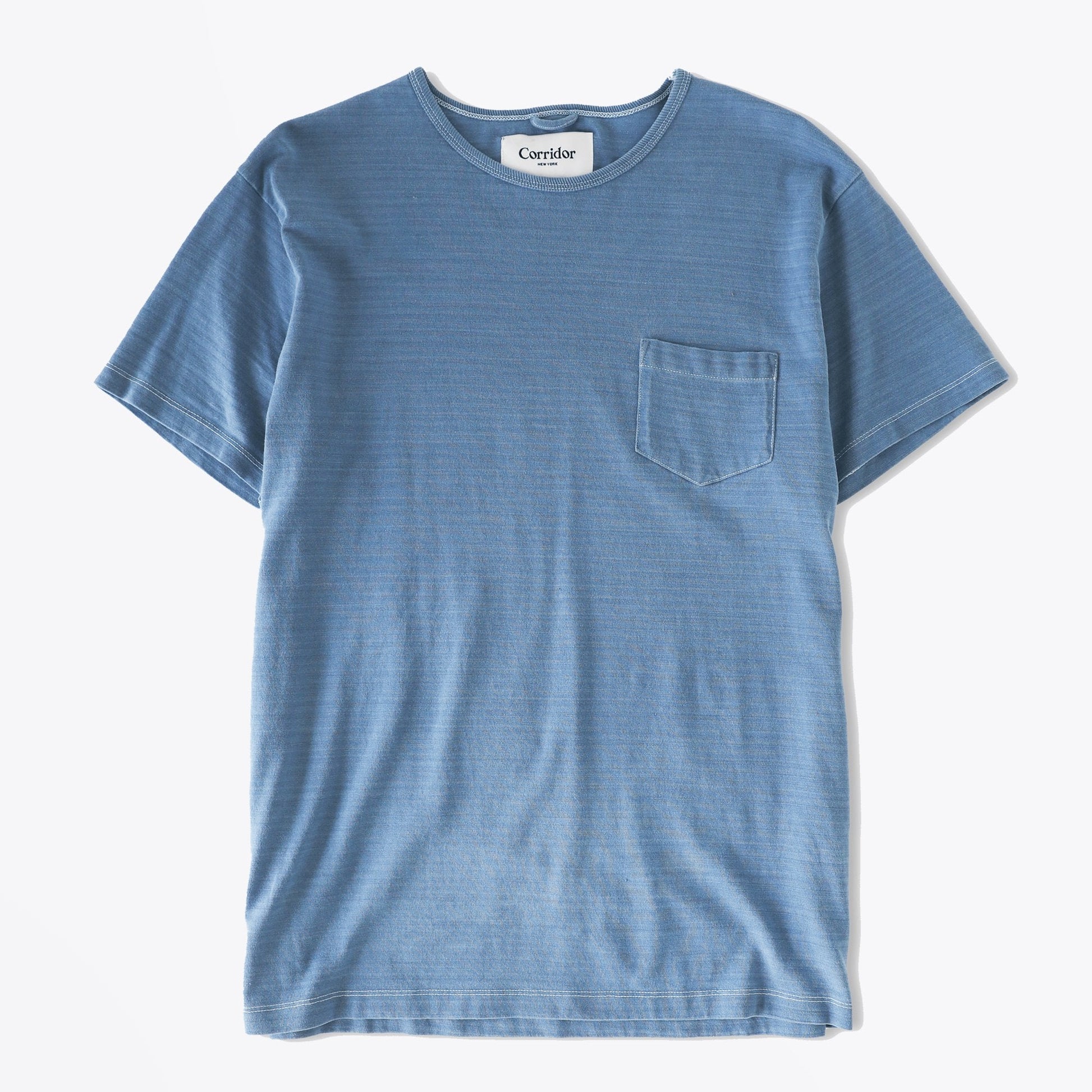 Brand new label to Mr & Mrs Stitch, the New York-based label, Corridor is an independent brand focused on contemporary American clothing, natural fibers, and responsible design and tailoring. The textiles and garments are designed in-house with selectively-partnered, ethically, and environmentally sustainable workshops specialized in the best quality production. This summer-ready lightweight tee is crafted in a soft cotton that has a great handle and is wonderfully light enough to make it easy to layer with jackets and coats. This casual t-shirt is finished with contrast white topstitching, short sleeves, crew neck and indigo over-dyed and washed out. Easy to wear in a loungewear set but equally as simple to assimilate into your casual wardrobe with a pair of our stylish trousers.