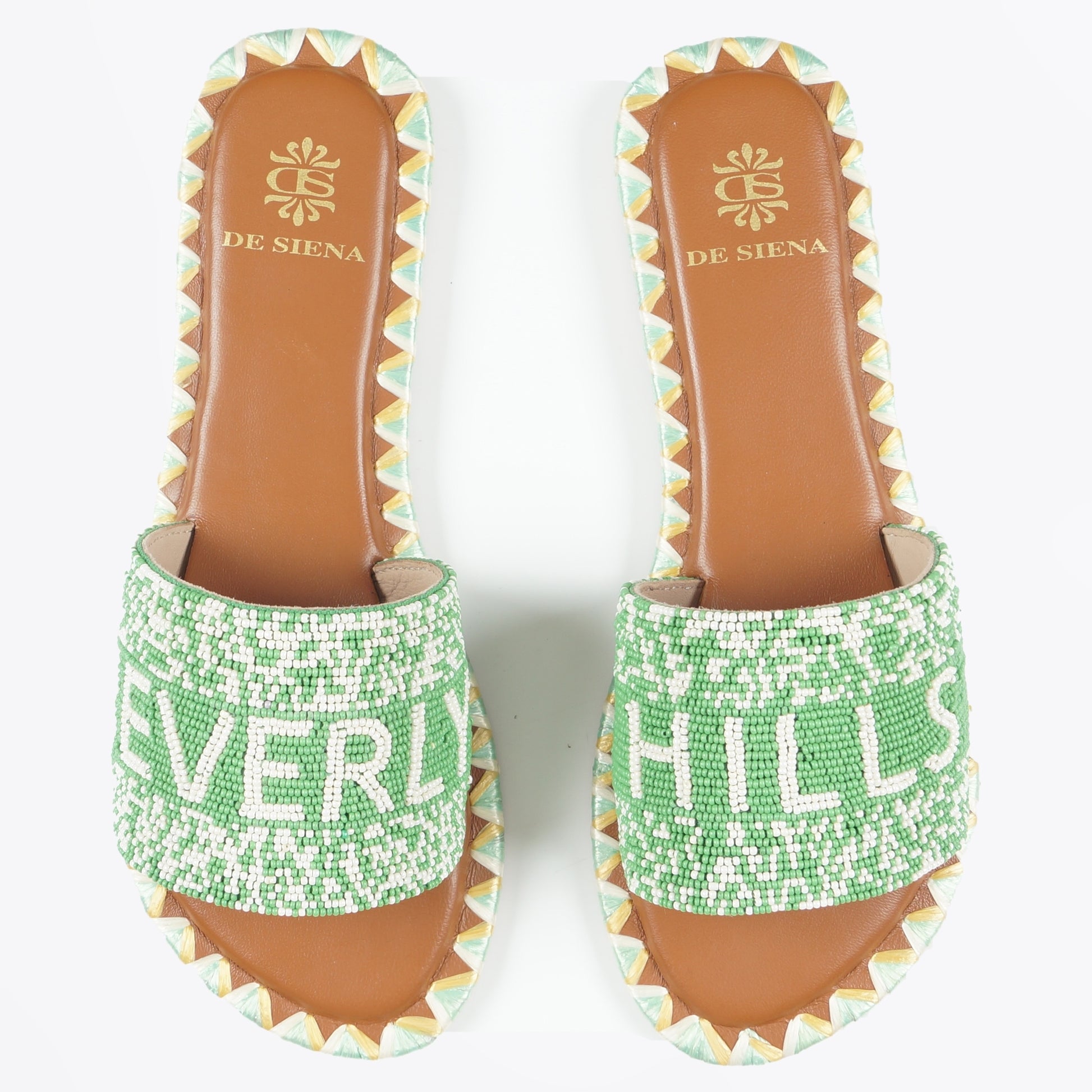 De Siena is a premium shoe brand created in 2010 and situated in Italy. At the heart of the brand is the focus on sustainable fashion and a commitment to environmental responsibility. A blend of natural raffia yarns, sun burnt colours and artisan hand woven textures give De Siena a unique and feminine style. These Beverly Hills green flat shoes have a round open toe with sole made with premium leather, the insole having leather stitching, logo embroidery and finished with the upper part of the sandal containing green and white glass beads. Wear these sandals with your favourite warm weather attire.