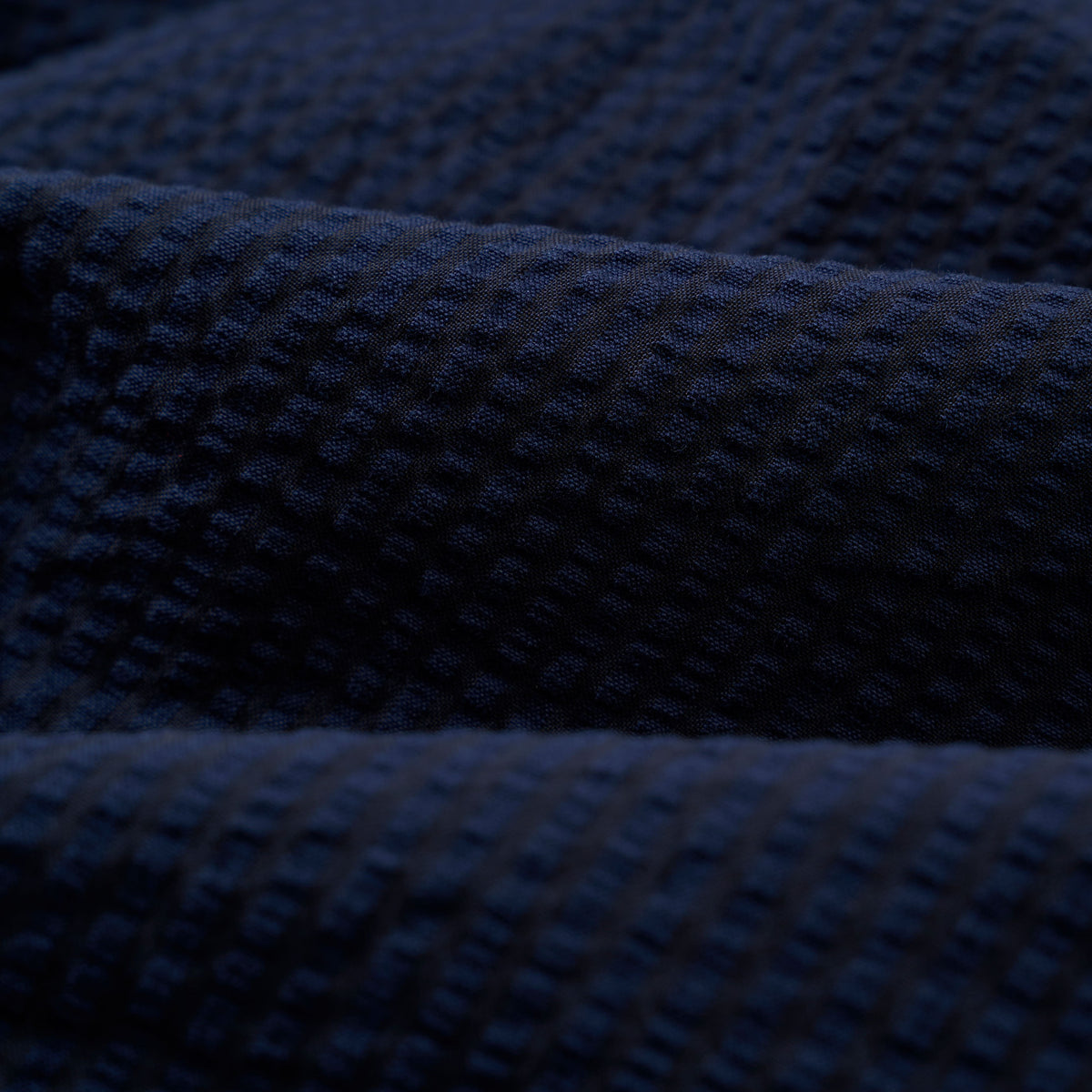 A contemporary two-button jacket crafted with relaxed tailoring and subtle waist shaping. The wider, elongated lapels create a modern silhouette that works effortlessly from office to weekend. Finished in navy with a refined derby stripe pattern, this piece offers versatile layering for any season.