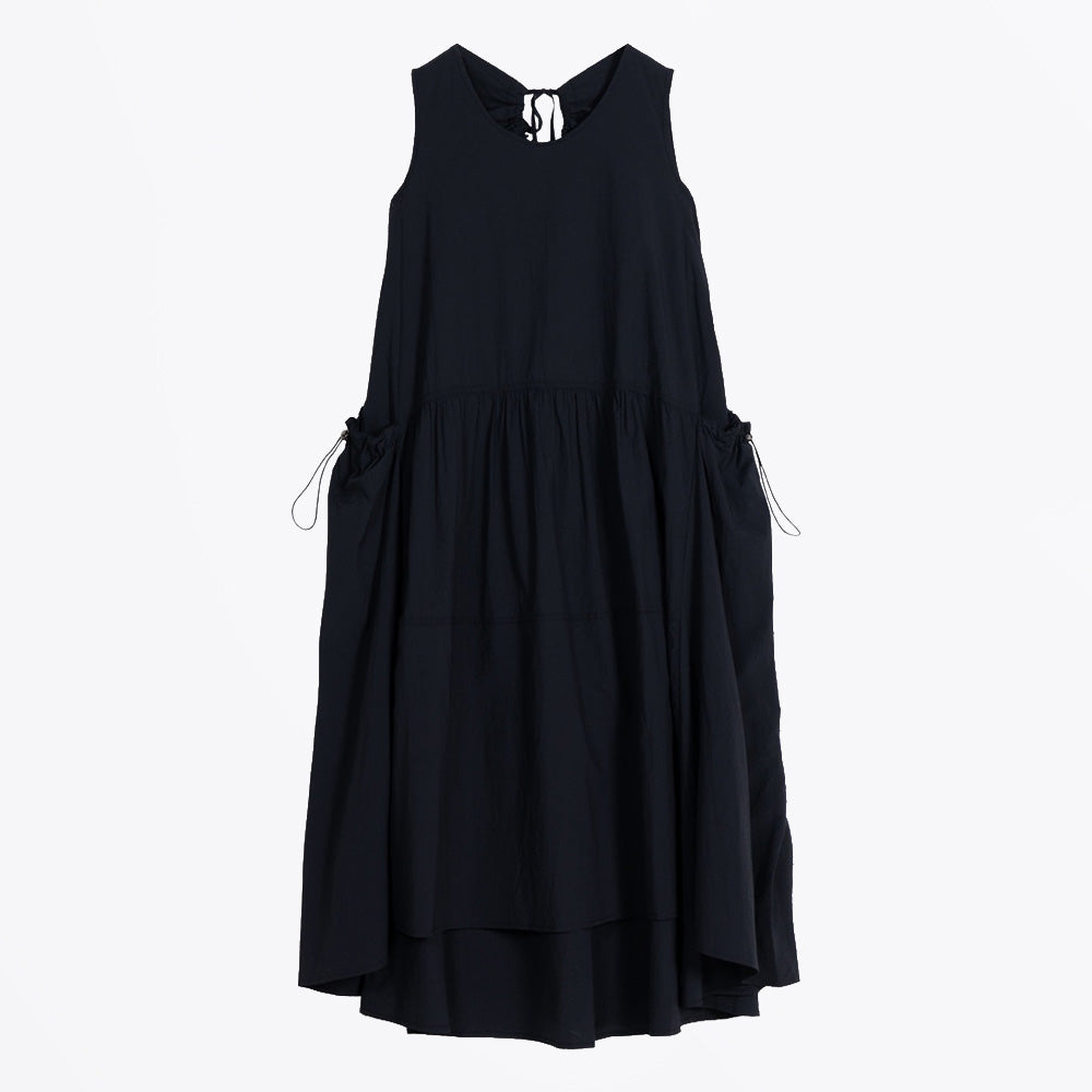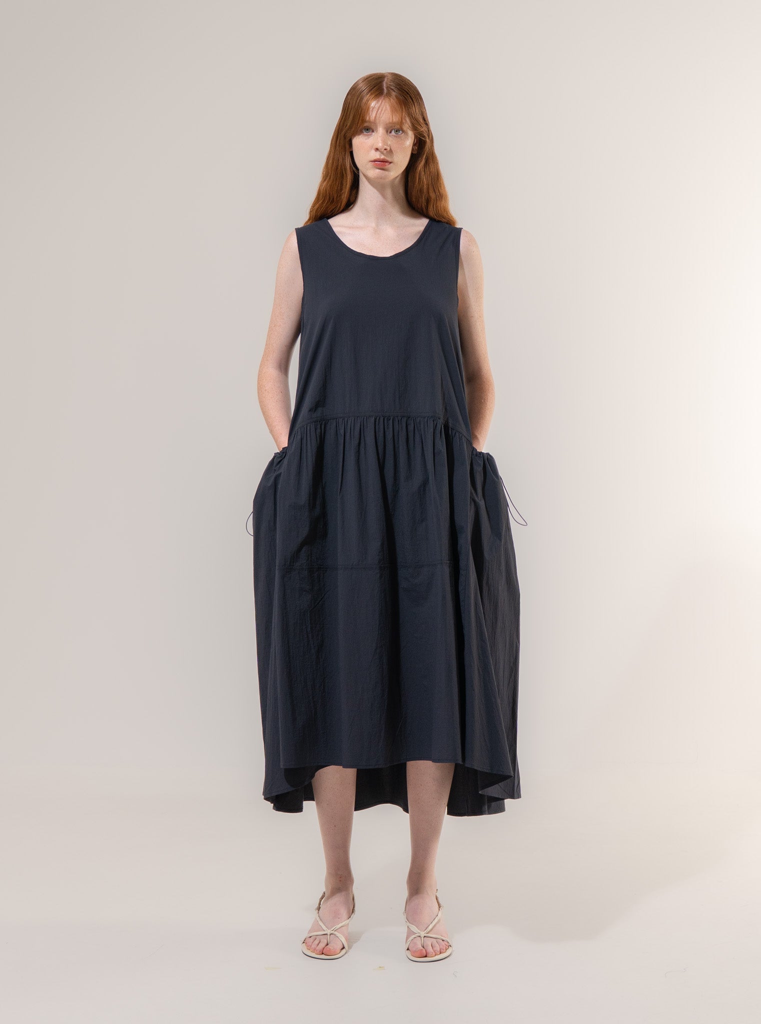 Embrace relaxed elegance with the Drawstring Volume Dress in Navy. This piece showcases a generously voluminous silhouette that moves with you, defined by adjustable drawstring details at the waist and hem. The flowing fabric creates an effortless, contemporary look perfect for layering or wearing solo. Ideal for those seeking comfort without compromising on style.