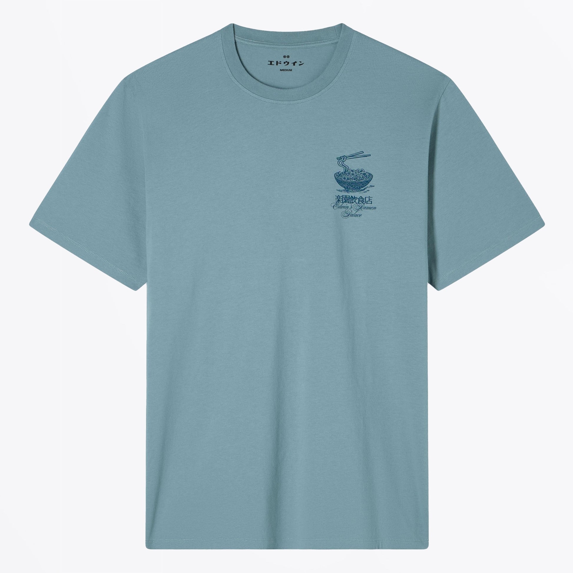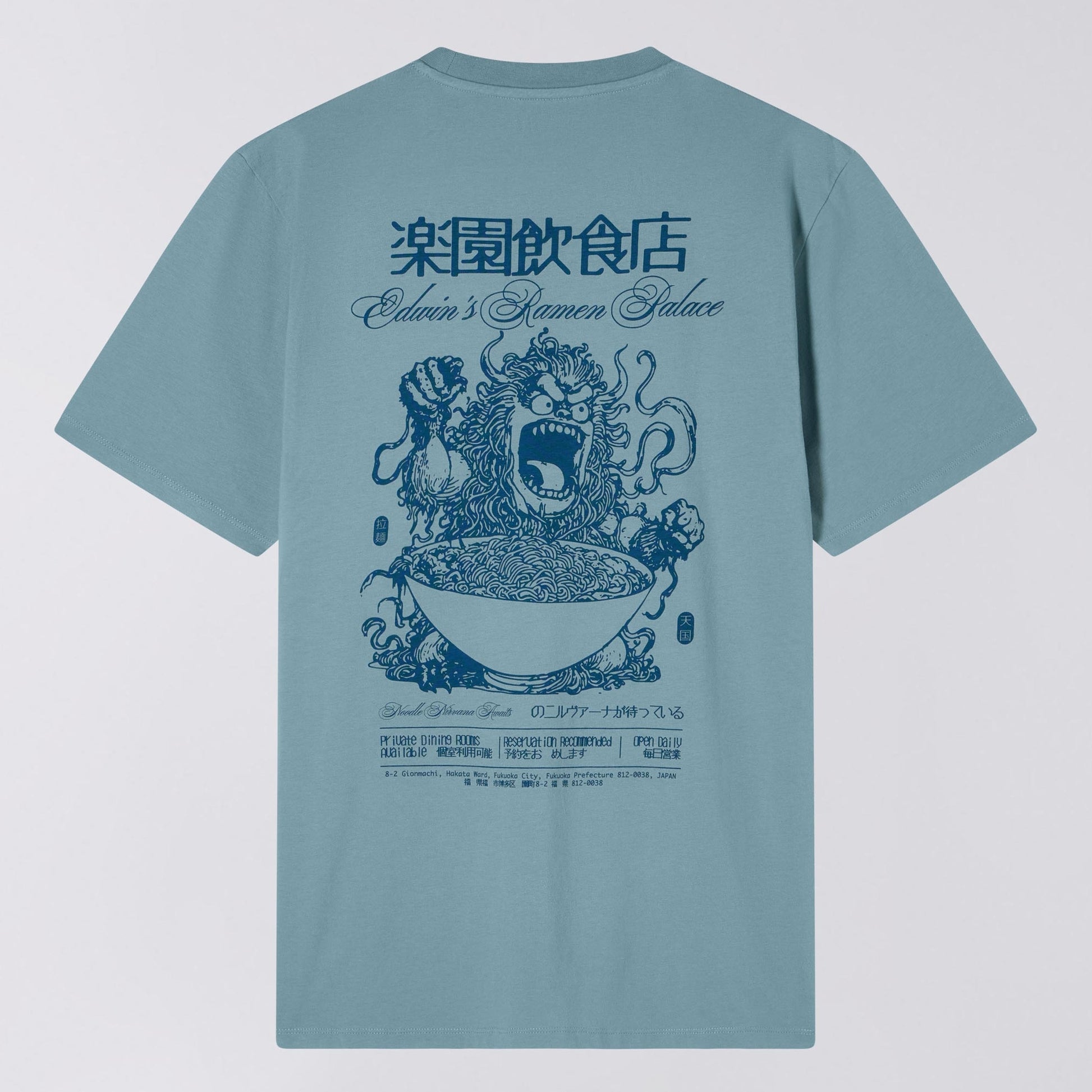 EDWIN is a progressive denim brand that blends their Japanese background, craftsmanship and expertise with a European contemporary flavour, vision, and attitude. Sure to add some Japanese influence on your wardrobe with this t-shirt. This arona blue t-shirt has a “ramen palace” print design on the chest and back, crew neckline and short sleeves and a regular fit. Wear this with nudie jeans and Victoria trainers.