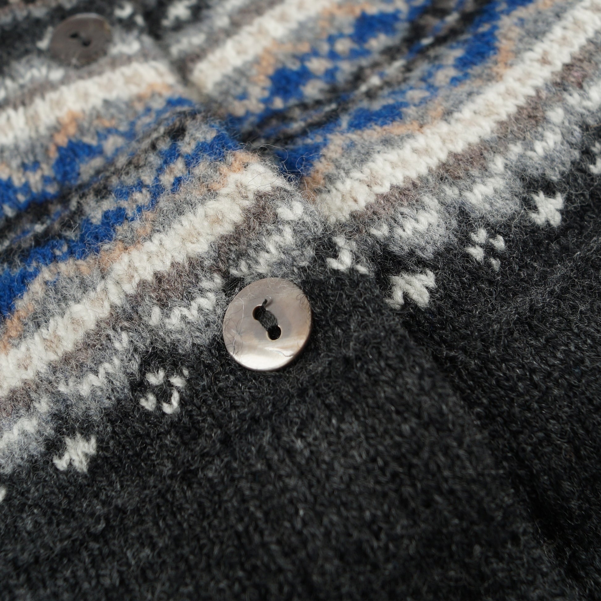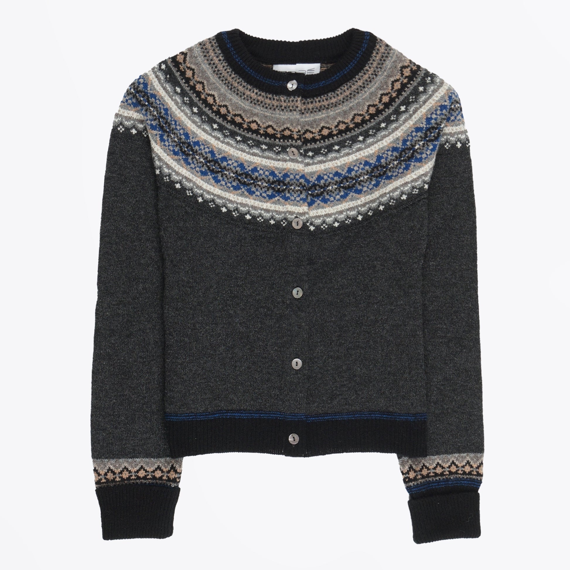 Founded in 1986 Eribe prides itself on Scottish manufacturing having their company based in Melrose in the Scottish borders. Eribe values people from the mills, supplier’s agents and of course the customers giving great attention to every aspect of their knitwear for consistent quality garments. Add some contemporary knitwear to your wardrobe with this Alpine cardigan. This cardigan has a Scottish fairisle yoke pattern across the chest, crew neckline, mother of pearls fastening, small detailing near the hem mimicking a bracelet, ribbed hem and cuffs. Wear this cardigan with some Paige jeans.