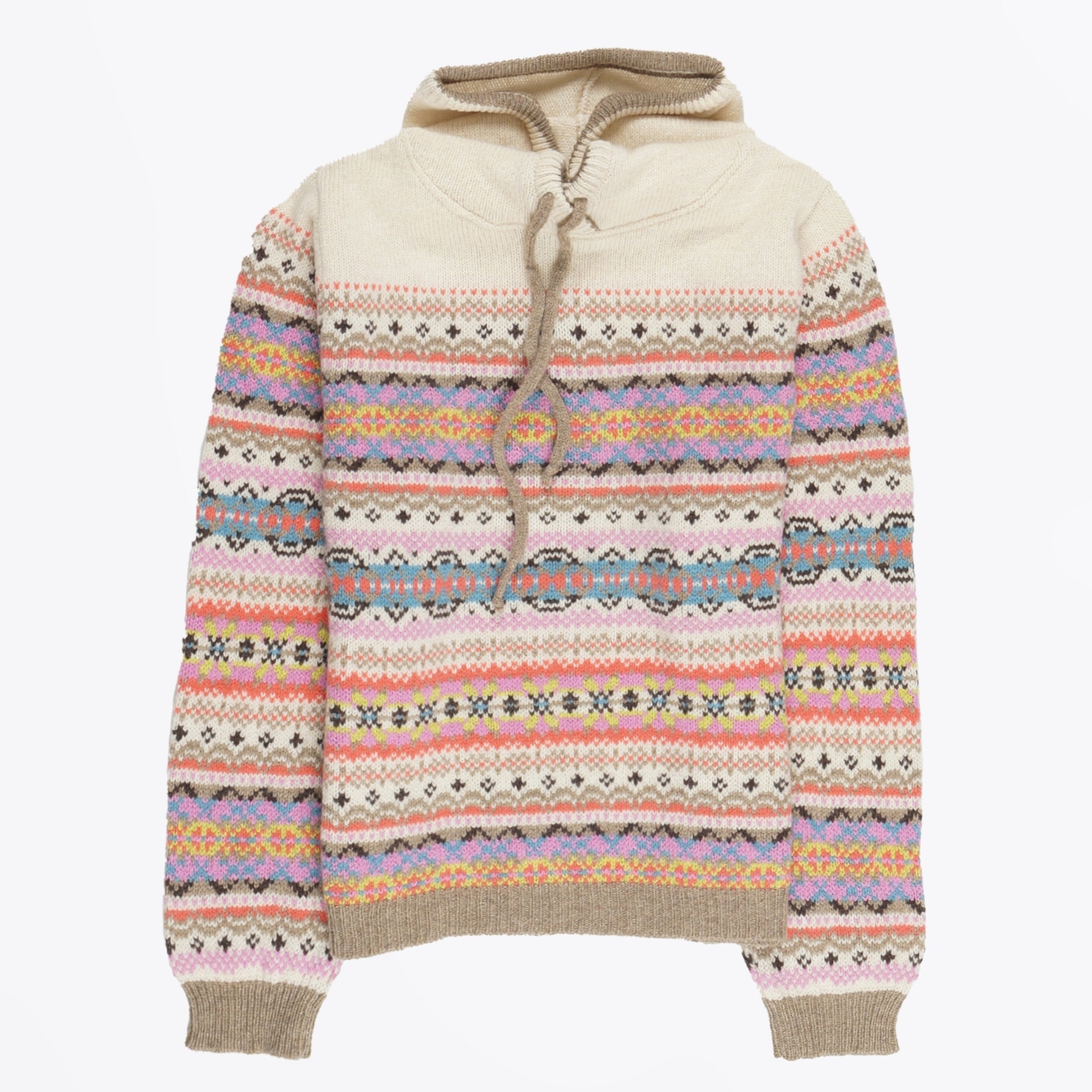 Founded in 1986 Eribe prides itself on Scottish manufacturing having their company based in Melrose in the Scottish borders. Eribe values people from the mills, supplier’s agents and of course the customers giving great attention to every aspect of their knitwear for consistent quality garments. Add some contemporary knitwear to your wardrobe with this Kinross hoody. This hoody has the traditional seasonal print design throughout, knitted firmer for warmth, drawstring hoody, ribbed hem and cuffs. Wear this hoody with some Paige jeans.