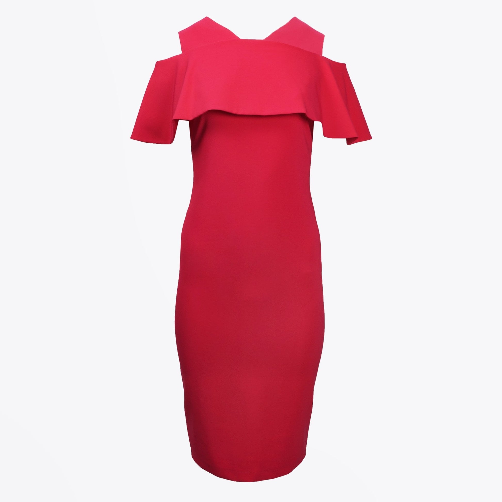 Luxury womenswear brand, Genese London specialises in contemporary designs displaying lavish detailing and sartorial elegance. Make a statement with this expertly tailored collection! This particular piece is a pink fitted dress with ruffle overlay, cold shoulder & a split at the back to allow for additional movement. This chic contemporary piece is perfect paired with high heel pumps or stilettos.