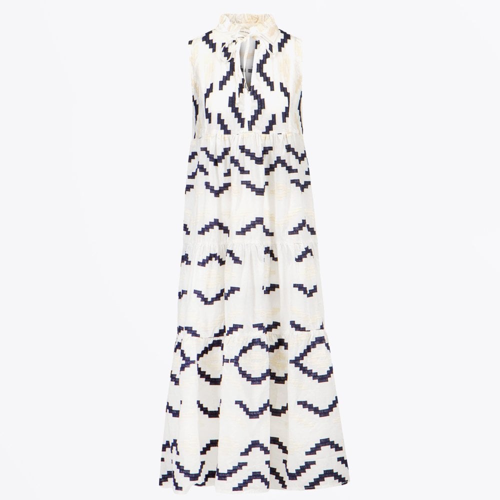 - Aztec Embroidered Sleeveless Maxi Dress - White-Blue