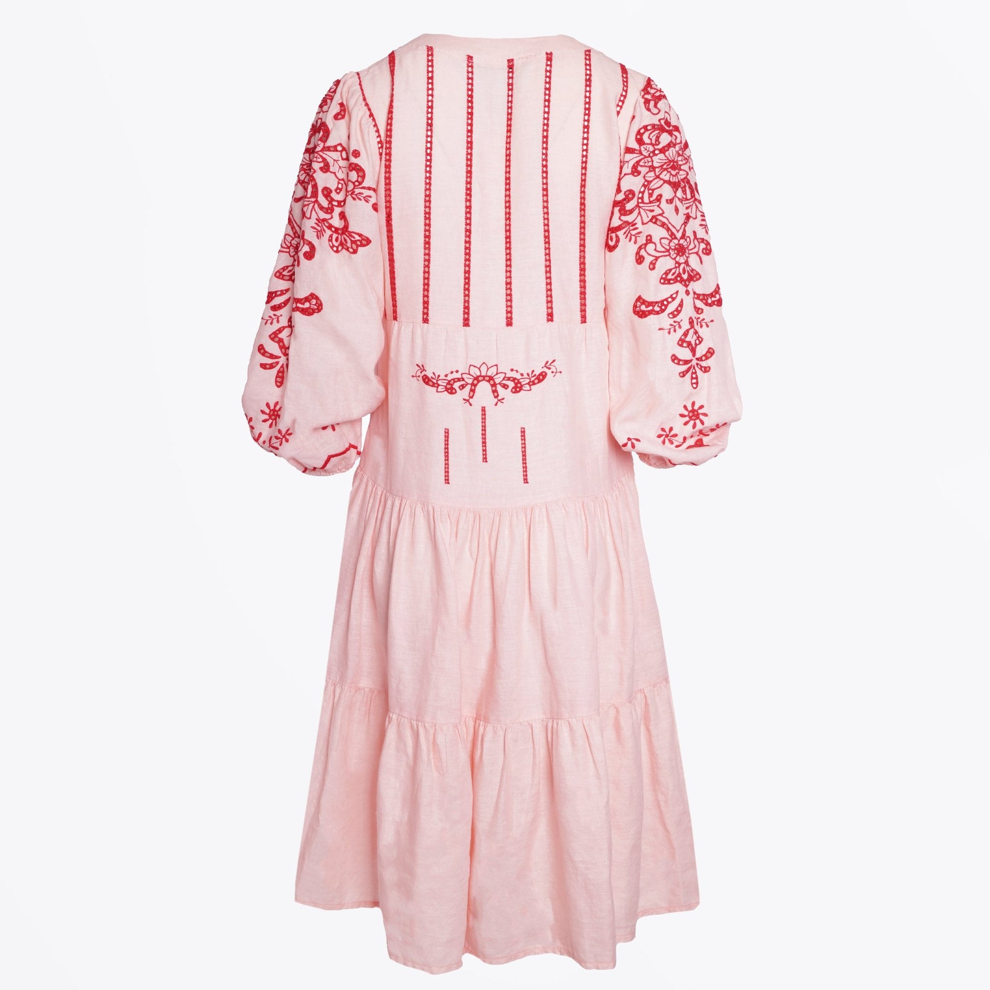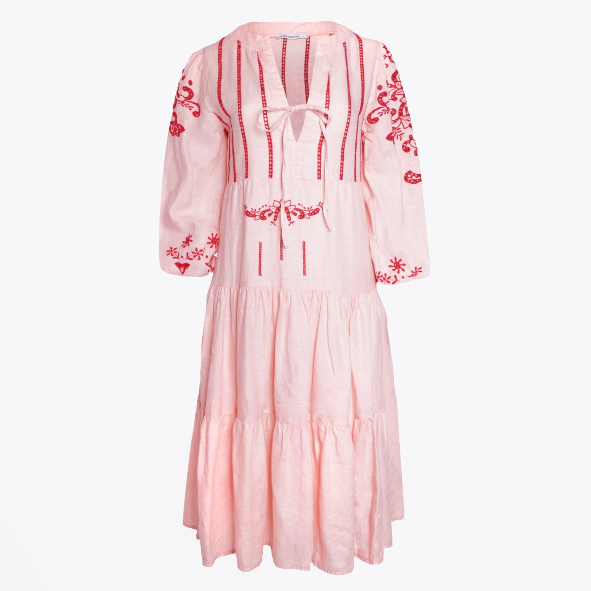 The Greek Archaic Kori Collection 2022 is a lifestyle brand that highlights resort wear and pays homage to the sun sea and island lifestyle amongst the Greek isles. Made in Greece, this new collection is light, bright and with a touch of quirkiness that is sure to brighten up your new season wardrobe.�� Perfect for your next holiday destination, this dress is crafted in a stunning pink linen material with a red broidery design. This dress features a multi-tier design with bell sleeves and a tied v-neckline. Perfect for your next holiday destination, wear with some heeled espadrilles for a cute dinner date outfit.